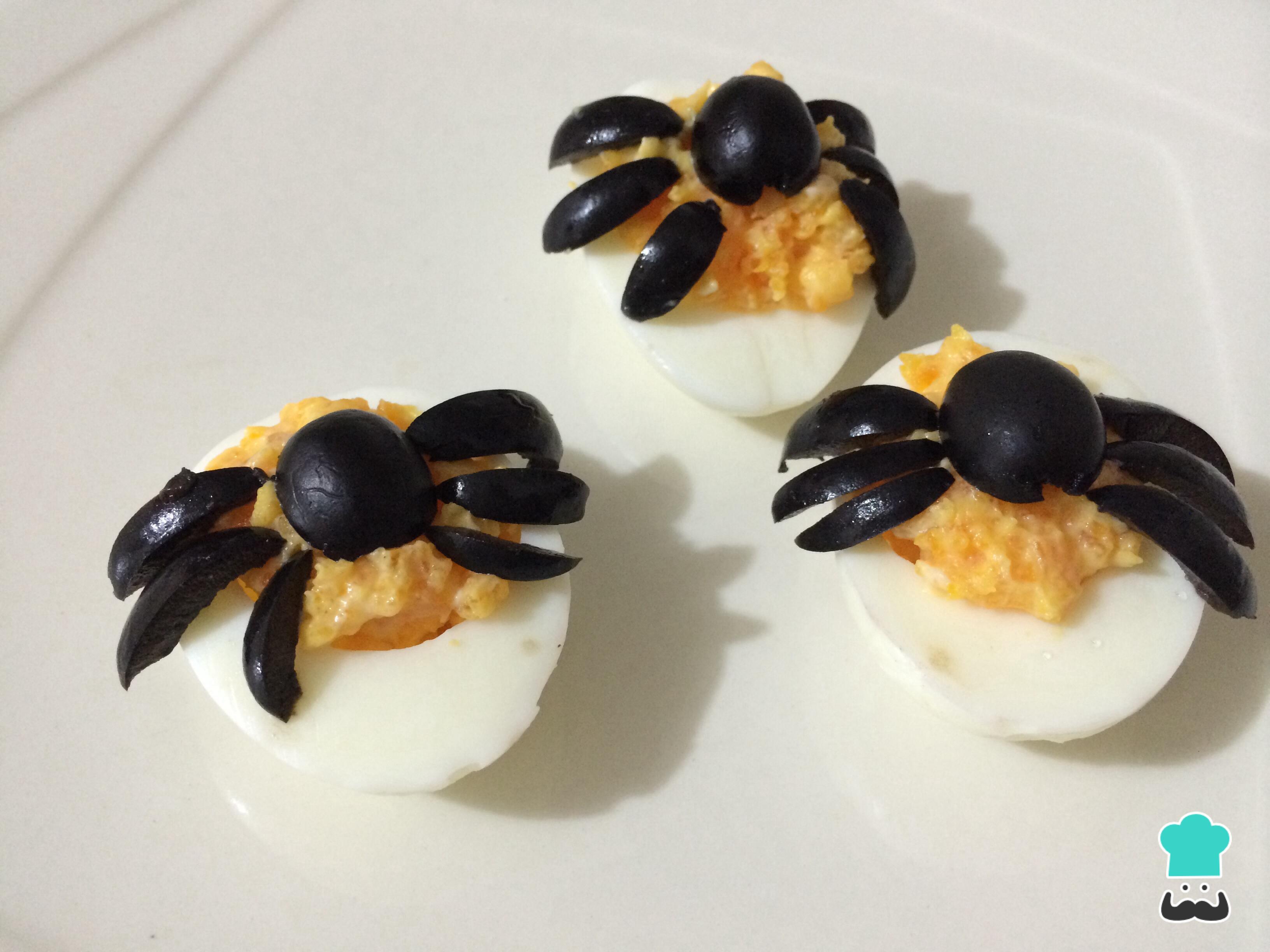 - Rellena los huevos con la mezcla y corónales con las aceitunas de araña. Para hacerlo, corta una aceituna por la mitad para lograr el cuerpo y con la otra mitad haz tiras finas para crear las patas.