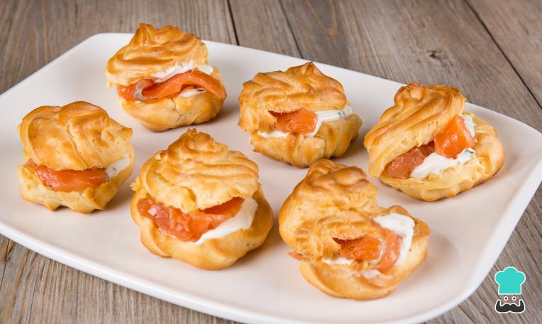 - Profiteroles o petit choux salados rellenos de salmón ahumado con queso crema y tomillo