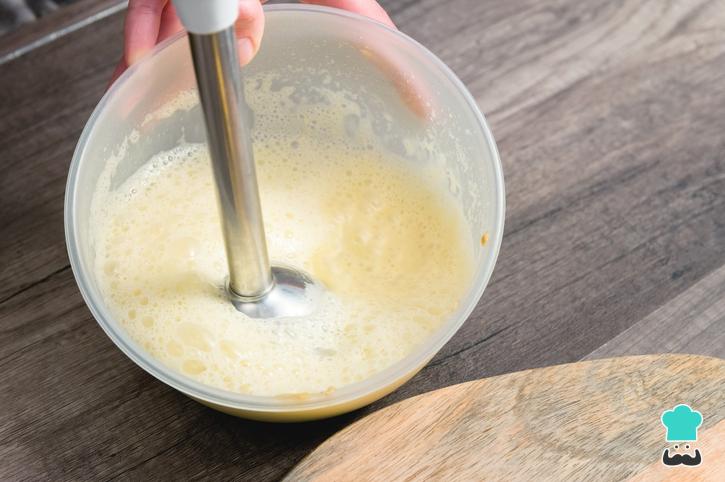- Batir a alta velocidad y/o mover la mezcla hacia todos lados antes de que emulsione. Si bates con una batidora de inmersión hazlo con velocidad mínima hasta que emulsione y sin parar (durante un minuto aproximadamente). Al principio, deja el artefacto sumergido en la misma posición hasta que comience a emulsionar la preparación. Luego, sube y baja, poco a poco, hasta cubrir todas las áreas y conseguir una mezcla homogénea. En cambio, si preparas la mayonesa en la licuadora, utiliza la velocidad media constante sin parar.