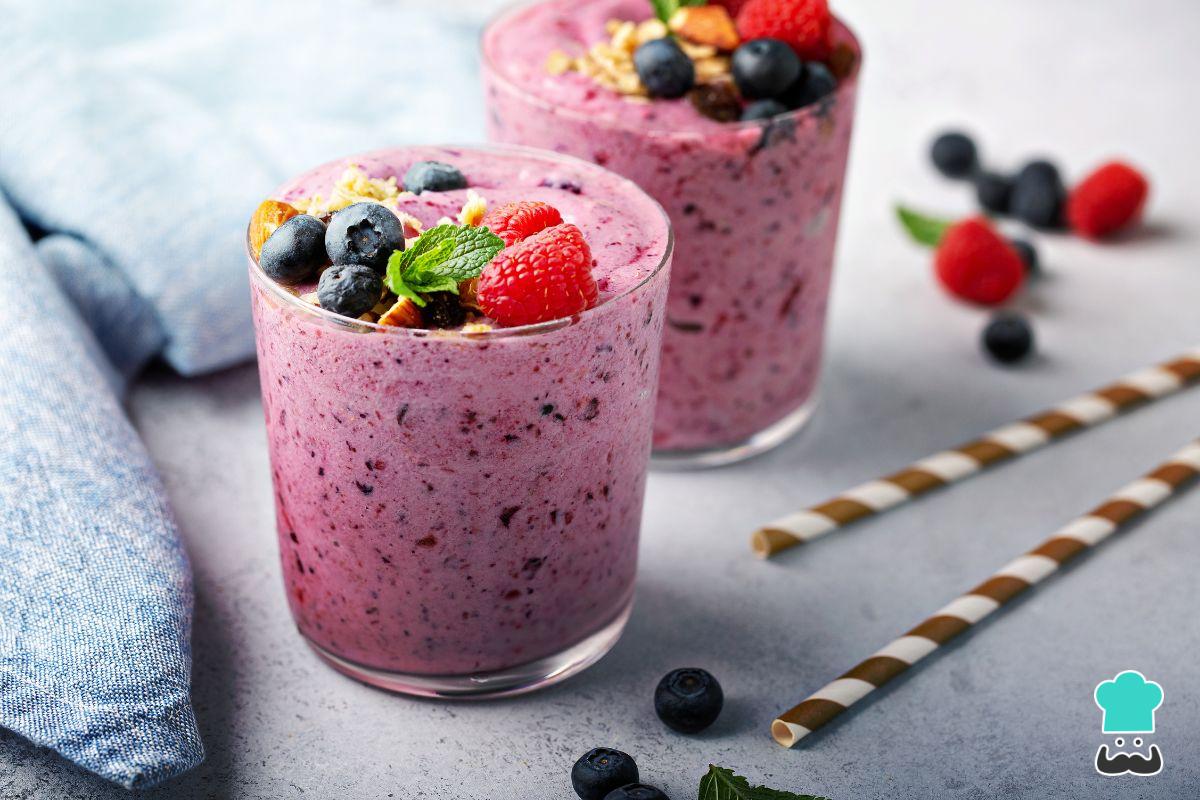 - Licuado de yogur griego, frutos rojos y miel
