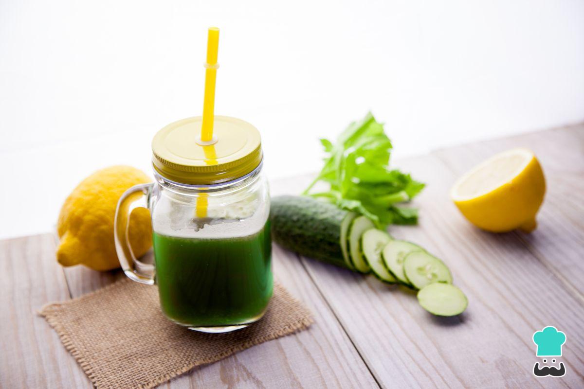 Este jugo verde detox es uno de los mejores batidos para adelgazar gracias a los potentes efectos de sus ingredientes: el apio es diurético y depurativo, por lo que te ayuda a eliminar toxinas y reducir la inflamación del cuerpo; por otro lado el pepino hidrata, desintoxica y reduce de forma efectiva el volumen abdominal; y por último el limón es alcalinizante, activa el hígado y mejora la quema de grasas. ¿El resultado? Un jugo verde para de peso en 7 días rápido, efectivo y refrescante.