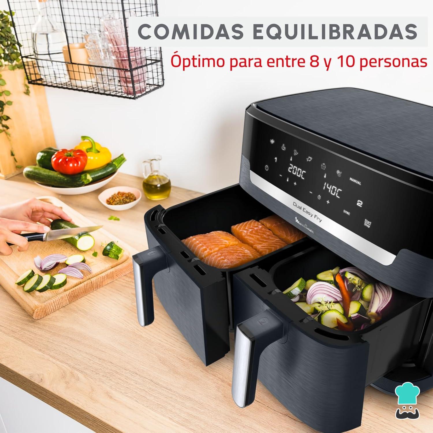Si buscas un modelo generoso en capacidad y con gran eficiencia, te encantará esta freidora de aire grande. Además, la Moulinex XXL Dual Easy Fry ofrece las siguientes características: