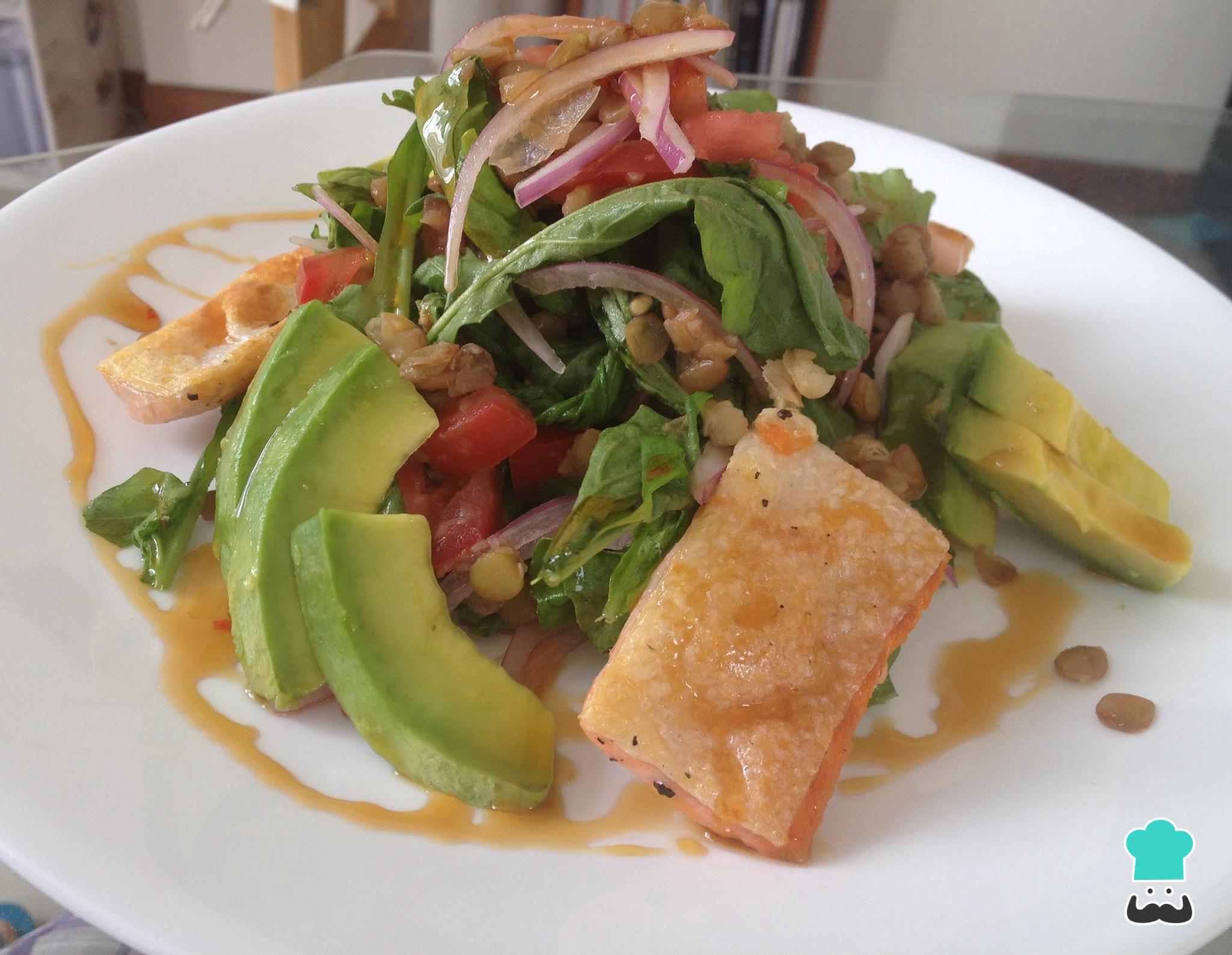 Si buscas ensaladas proteicas vegetarianas, aquí tienes una propuesta súper deliciosa, nutritiva y con proteínas por duplicado. El tofu o queso de soja califica como una proteína vegetal de excelente calidad, pues provee al organismo de 10 aminoácidos esenciales. Además, aporta otros nutrientes como lecitina, calcio (contiene más que la carne), Omega 6, Omega 3, minerales, entre otros.