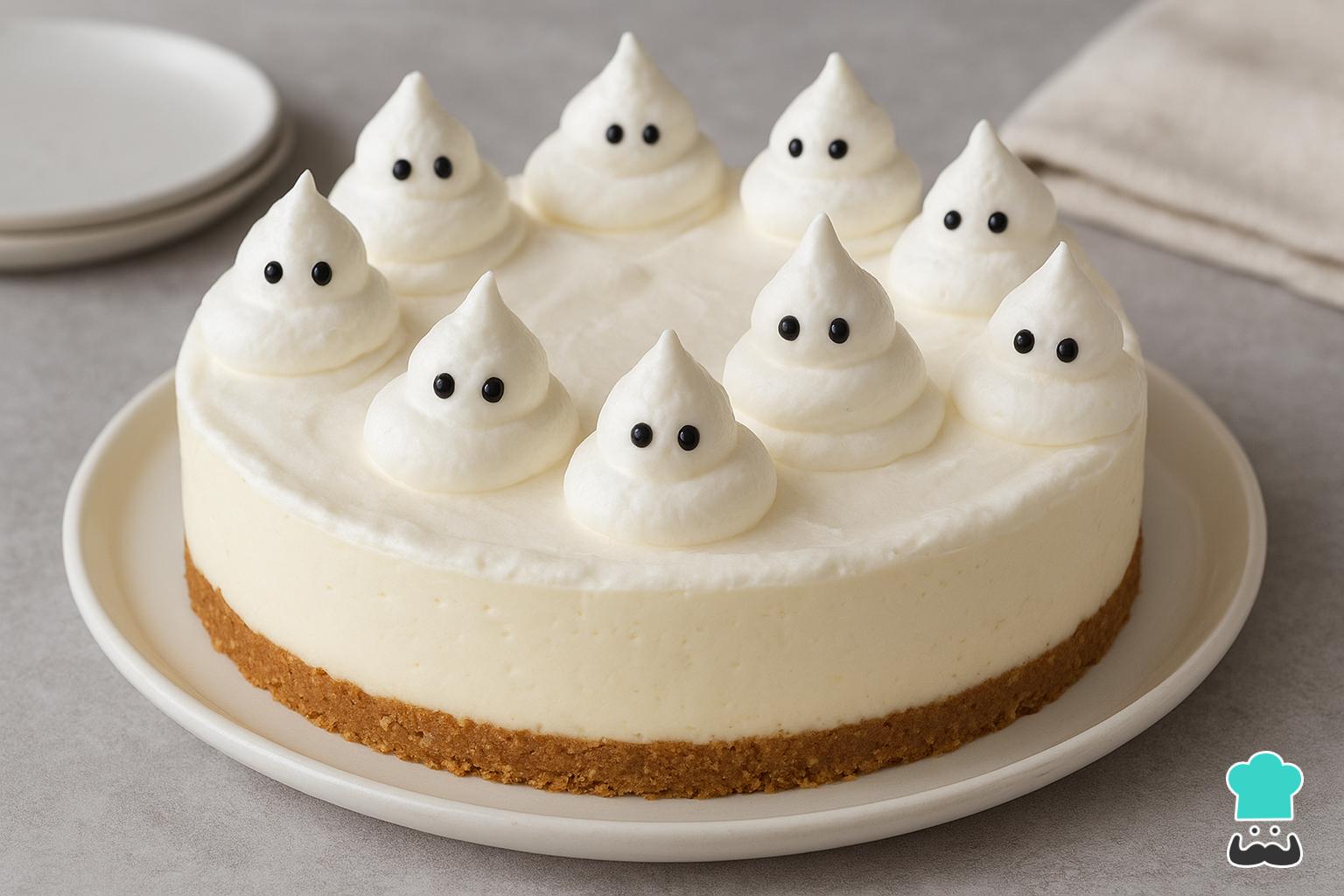 Dulce, cremosa y muy original. Esta tarta de Halloween para niños es perfecta para disfrutar con los más pequeños de la casa de esta festividad, porque este fantasma de chocolate blanco puede convertirse en un elemento tierno e imprescindible en tu decoración de Halloween. Si quieres que la tarta sea mucho más divertida podrás colocar figuras comestibles de ojos, murciélagos o calabazas. Si buscas tartas de Halloween fáciles y rápidas, sin necesidad de horno, esta es la tuya.