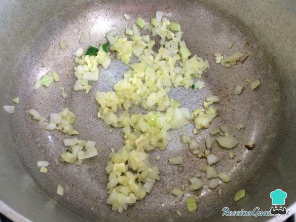 Mientras tanto, hacemos un refrito con el ajo y la cebolla picados y el pimentón dulce o de la Vera al gusto.