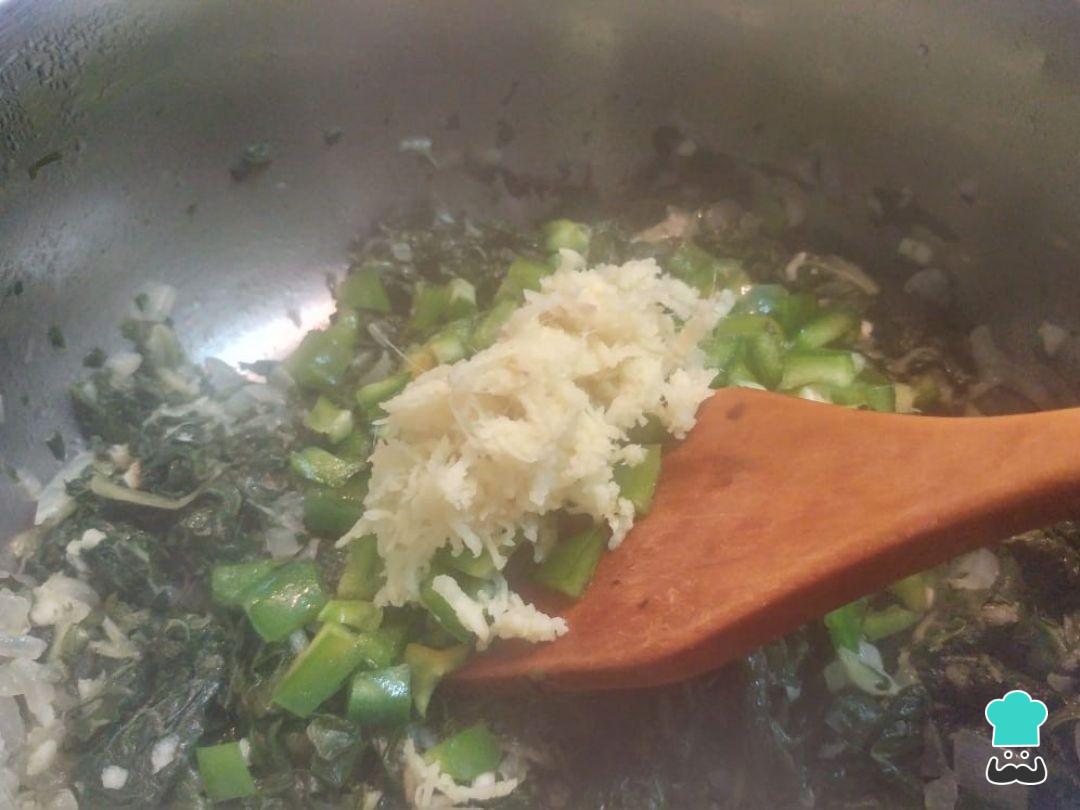 Añade el pimiento, el zumo de limón, la sal, el cardamomo, la pimienta, el jengibre y el pimentón. Cocina las acelgas con especias hasta que se ablande el pimiento.