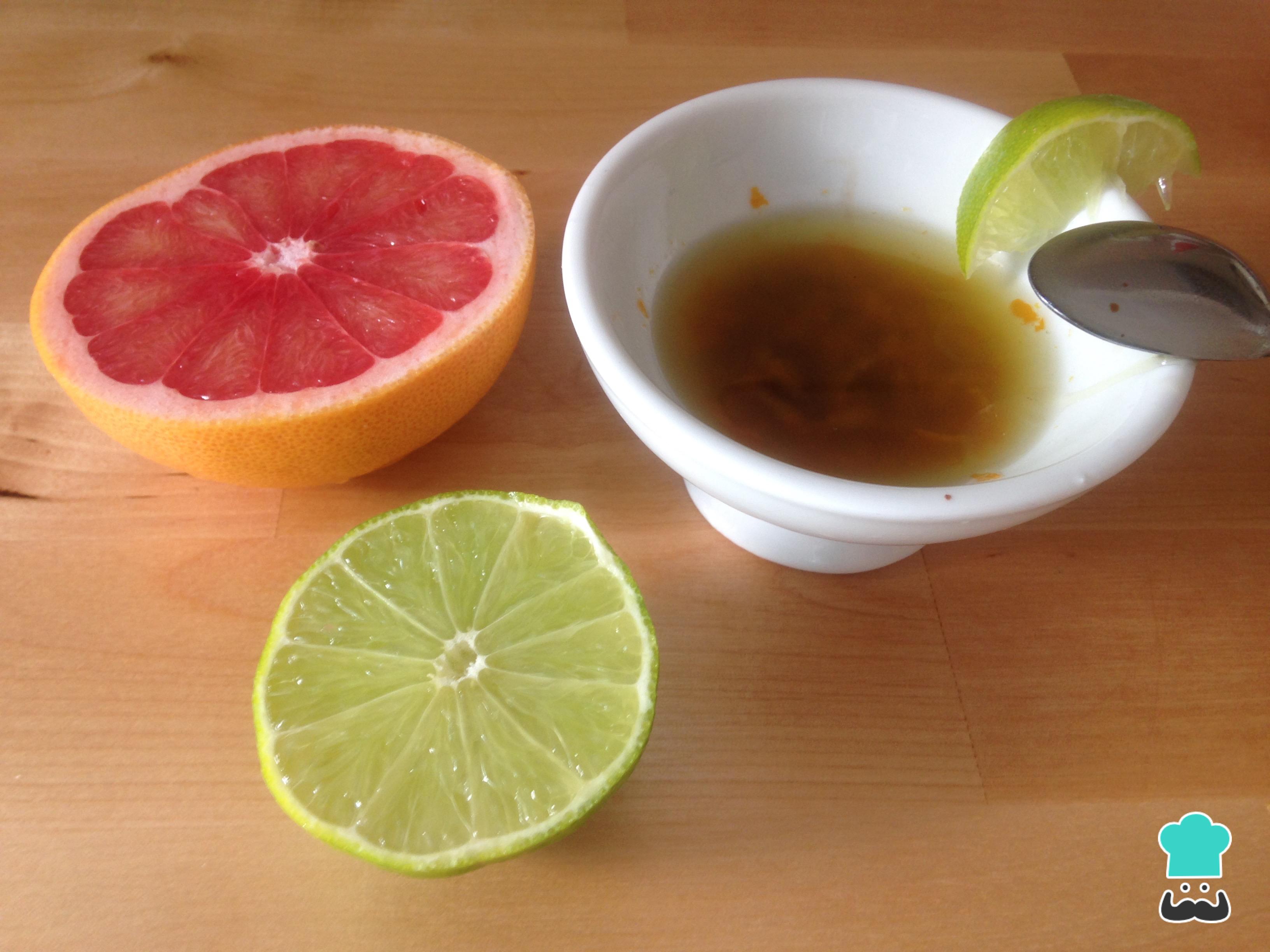 En un bol, mezclamos los zumos, tanto el de pomelo como el de lima junto con la ralladura de naranja y el azúcar. Movemos hasta que se integre bien el azúcar.