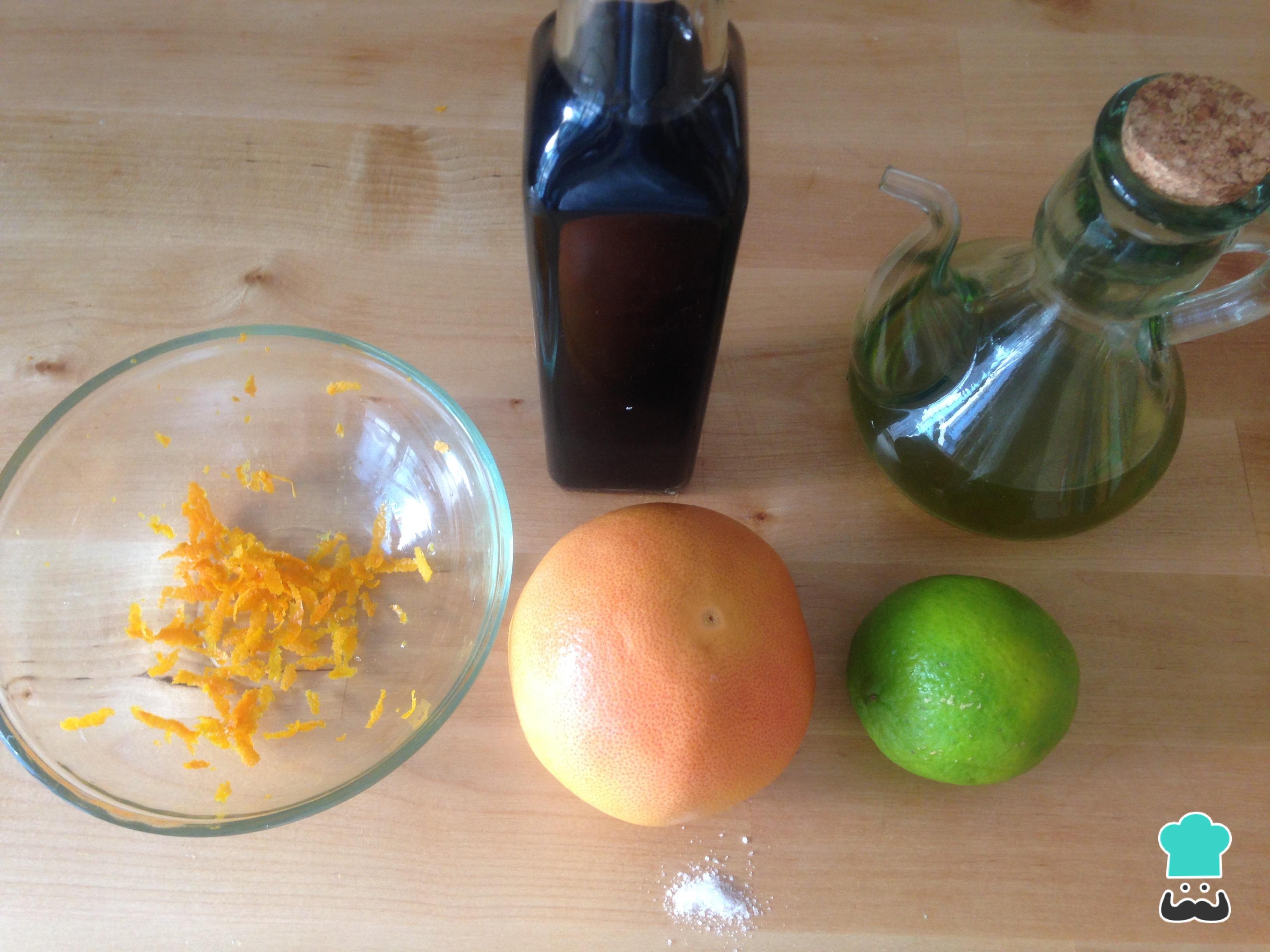 Reunimos todos los ingredientes para preparar el aderezo para ensalada cítrica.