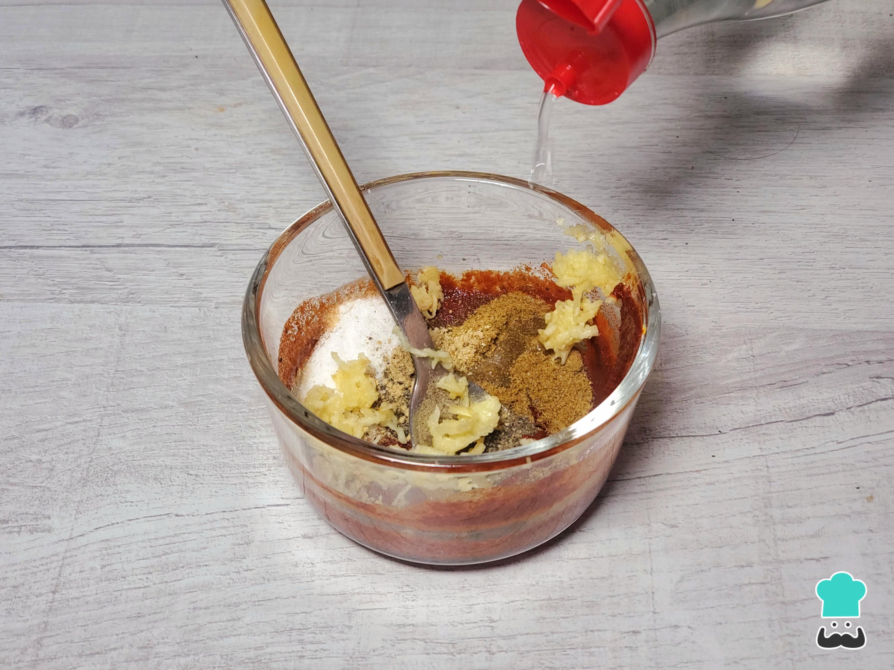 Comienza prepara el adobo: incorpora ají panca en pasta, ajo molido o picado, comino y pimienta negra molidos, achiote en polvo, un par de cucharaditas de sal y vinagre. Remueve bien.