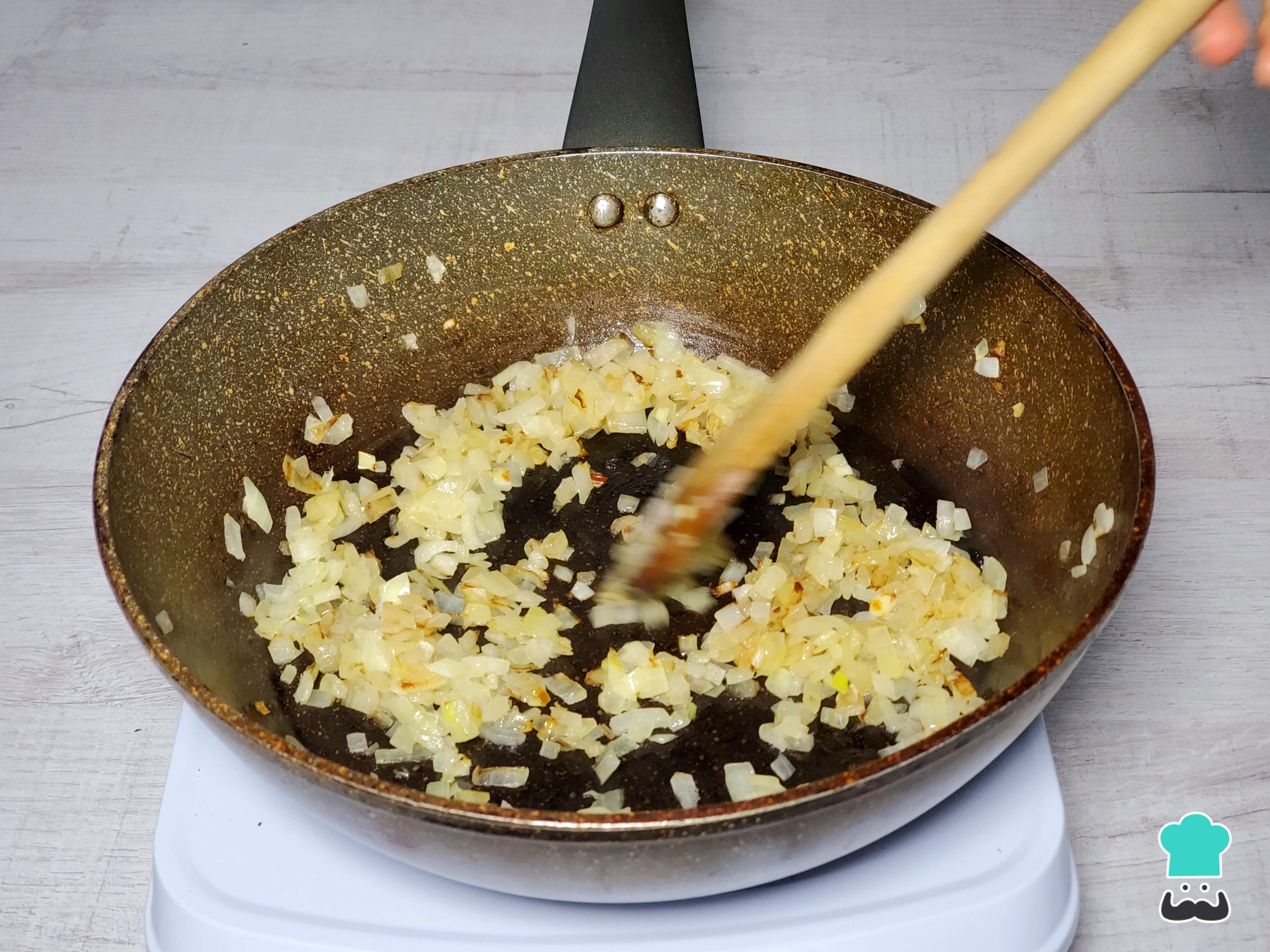 Al día siguiente, en una olla o sartén profunda, sofríe la cebolla picada finamente hasta que esté traslúcida.