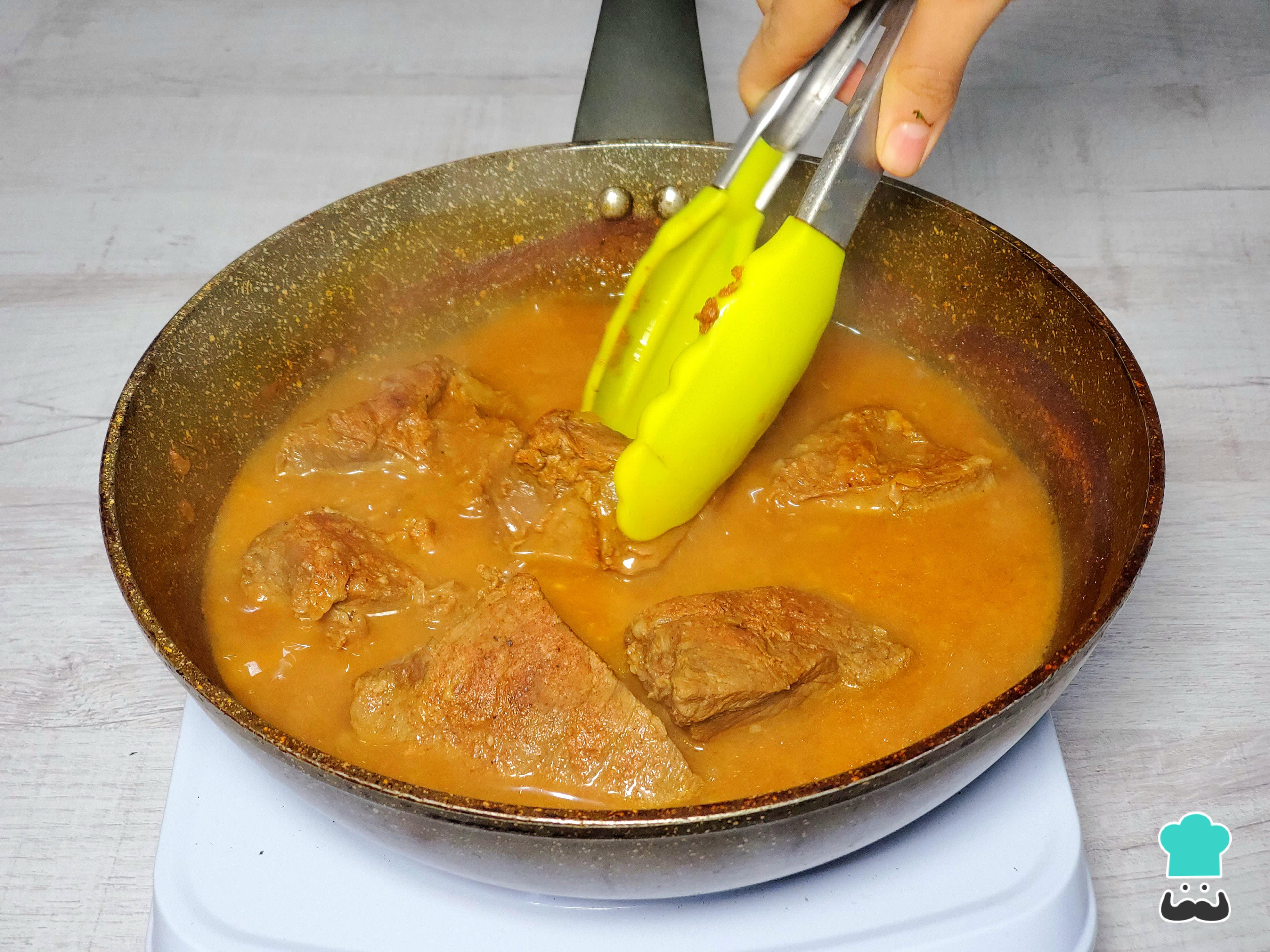 En ese momento, incorpora la carne con su marinada y cubre con un par de cucharones de caldo de res, o agua si no dispones de caldo. Deja que hierva a fuego medio-bajo durante unos 30 minutos, o hasta que la carne esté bien cocida y suave.
