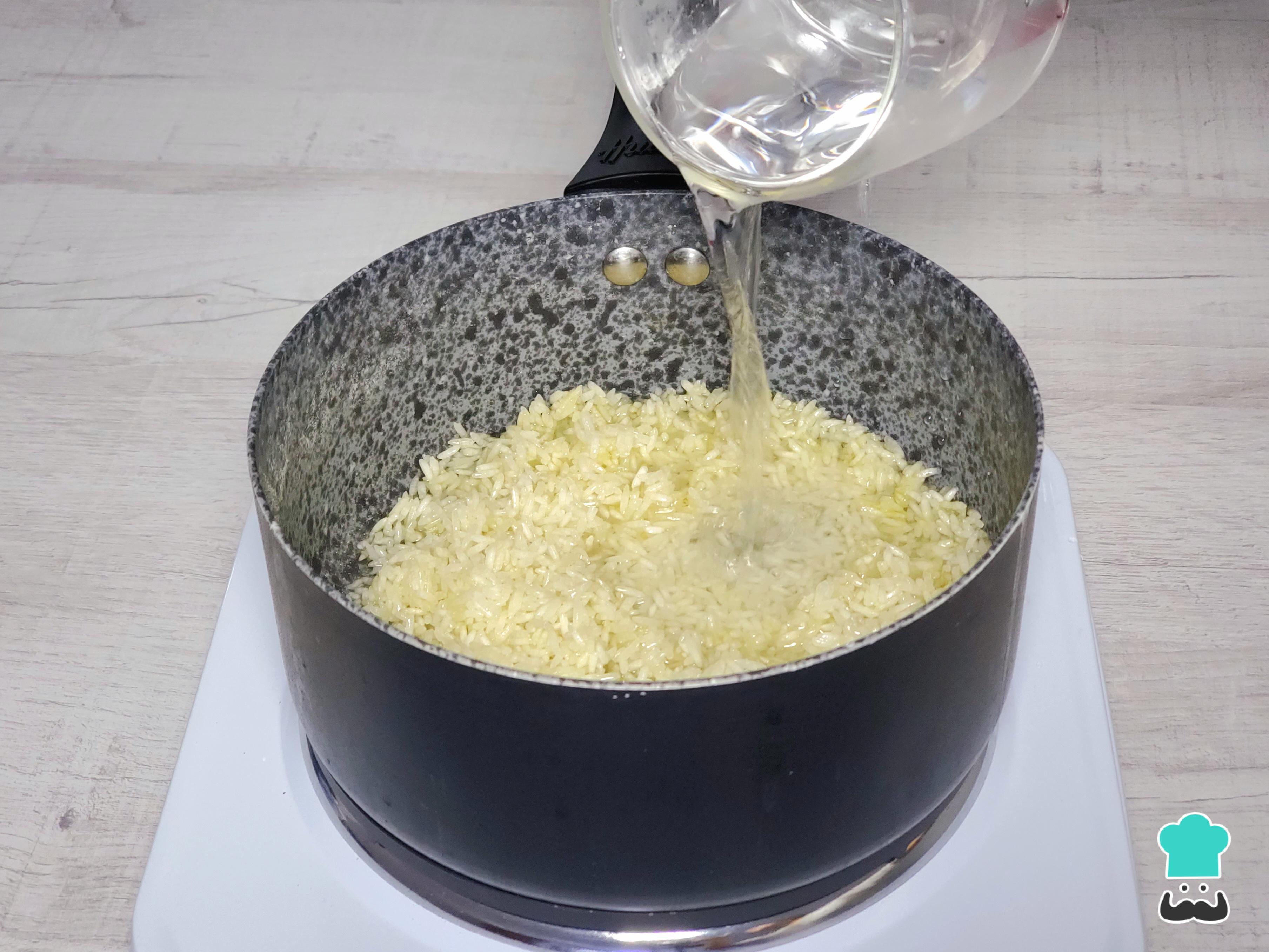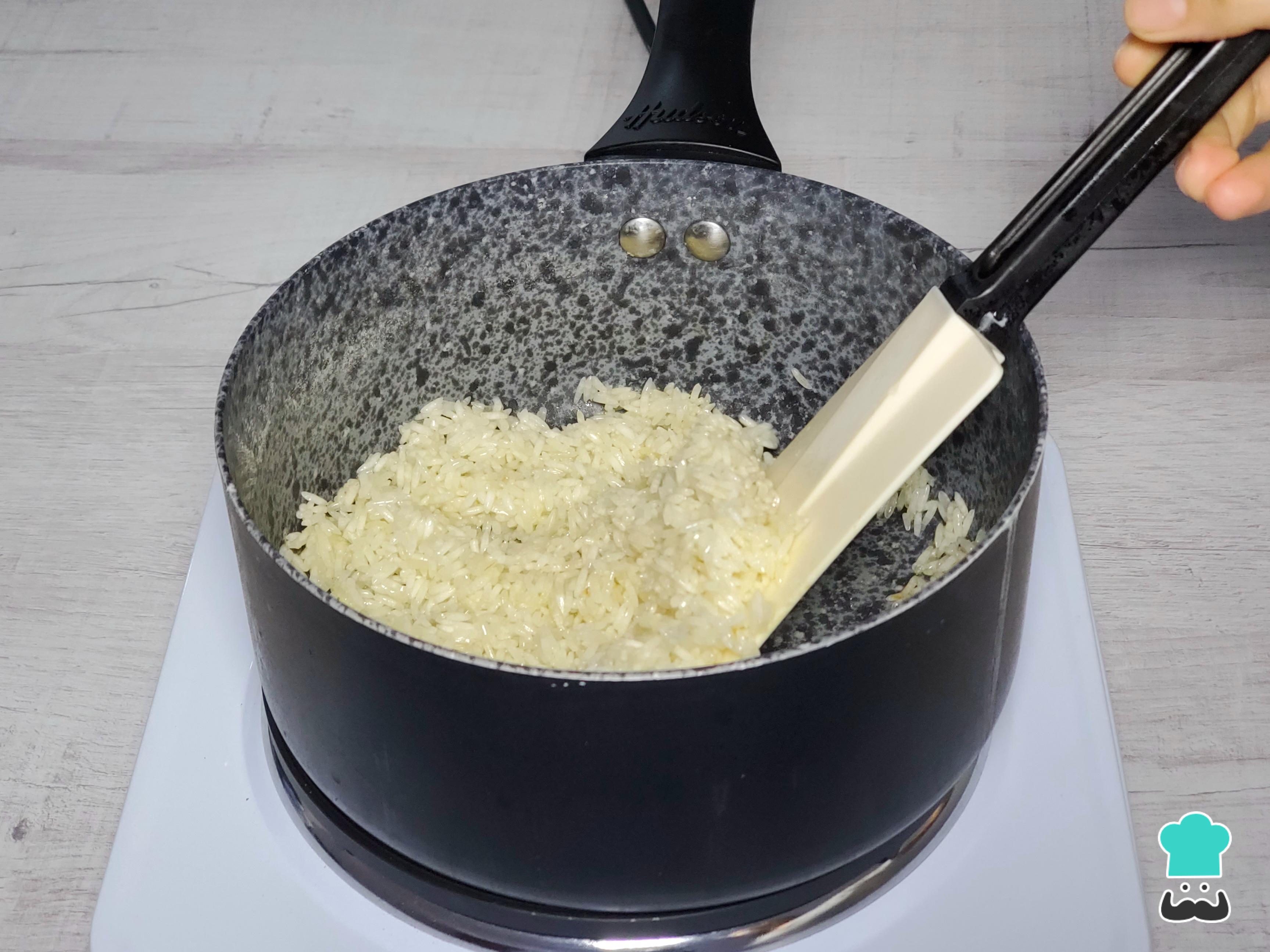 Para el arroz, añade un buen chorro de aceite en una olla pequeña o en la arrocera. Agrega el arroz blanco y remueve por unos minutos junto con una cucharadita de ajo picado para nacarar el grano y lograr una textura más suelta.