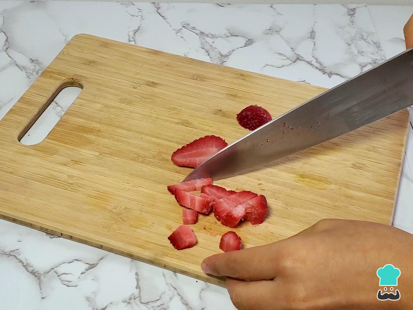 Empieza lavando y cortando las fresas; colócalas sobre una tabla de cortar y retira las hojas junto con los tallos. Luego, ponlas en un envase o en una bolsa hermética y congélalas hasta que estén completamente endurecidas. Puedes reservar algunas y cortarlas en cubos pequeños para decorar. Si prefieres trozos helados de fruta, congela las fresas enteras y, una vez congeladas, córtalas en cubos pequeños y reserva en el congelador.