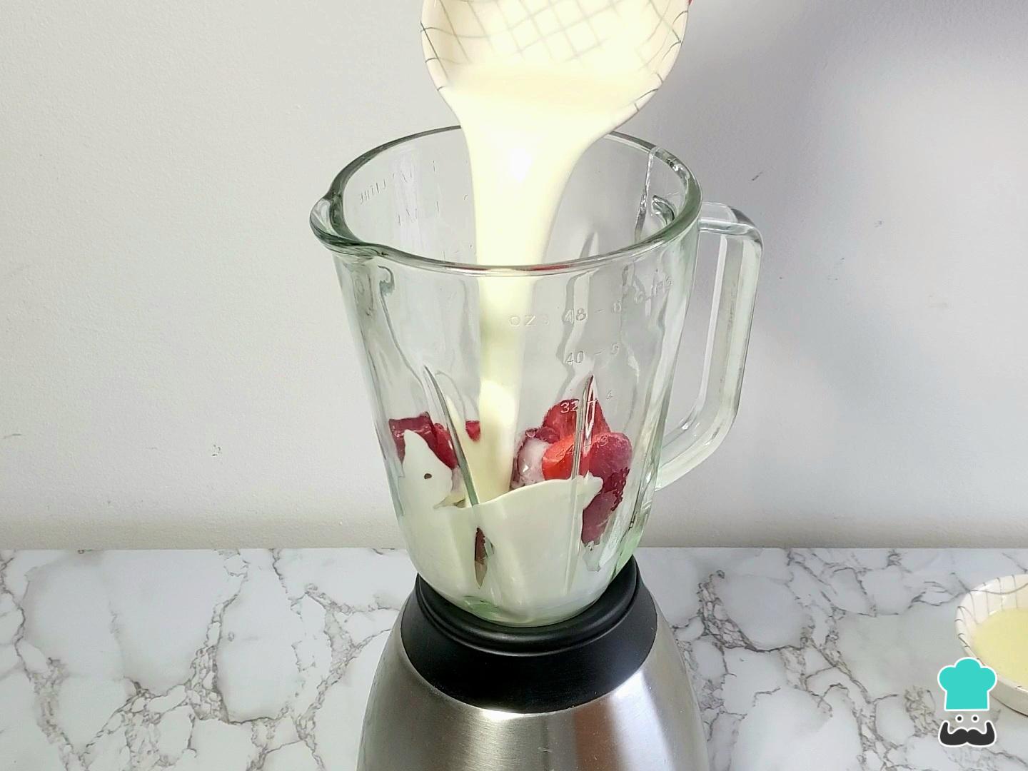 Antes de servir, coloca en el vaso de la licuadora las fresas enteras congeladas, la leche evaporada, la leche condensada y el agua. Si deseas una bebida más cremosa, puedes agregar cubos de hielo y aromatizar con esencia de vainilla.