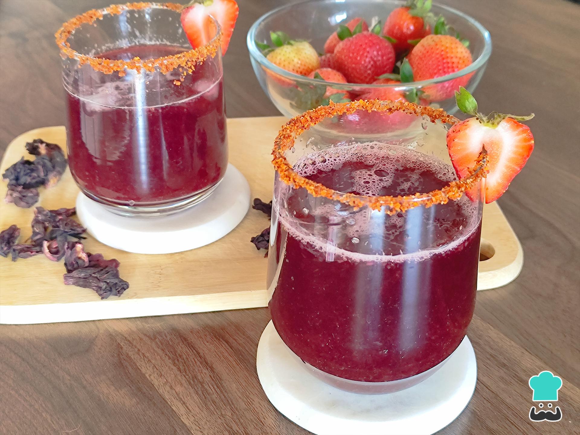 Por último, si te gusta un toque ácido extra, prepara unos vasos con escarchado de chile en polvo, agrega hielo al gusto y vierte un poco del agua de Jamaica con fresa, decora también con rodajas de fresa. ¡Listo! Cuéntanos en los comentarios tu opinión y comparte con nosotros una fotografía del resultado final.