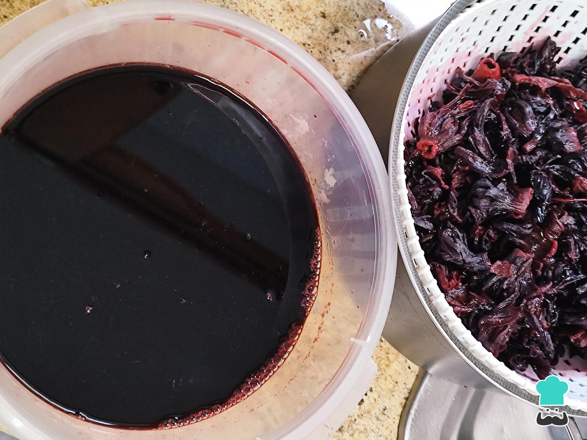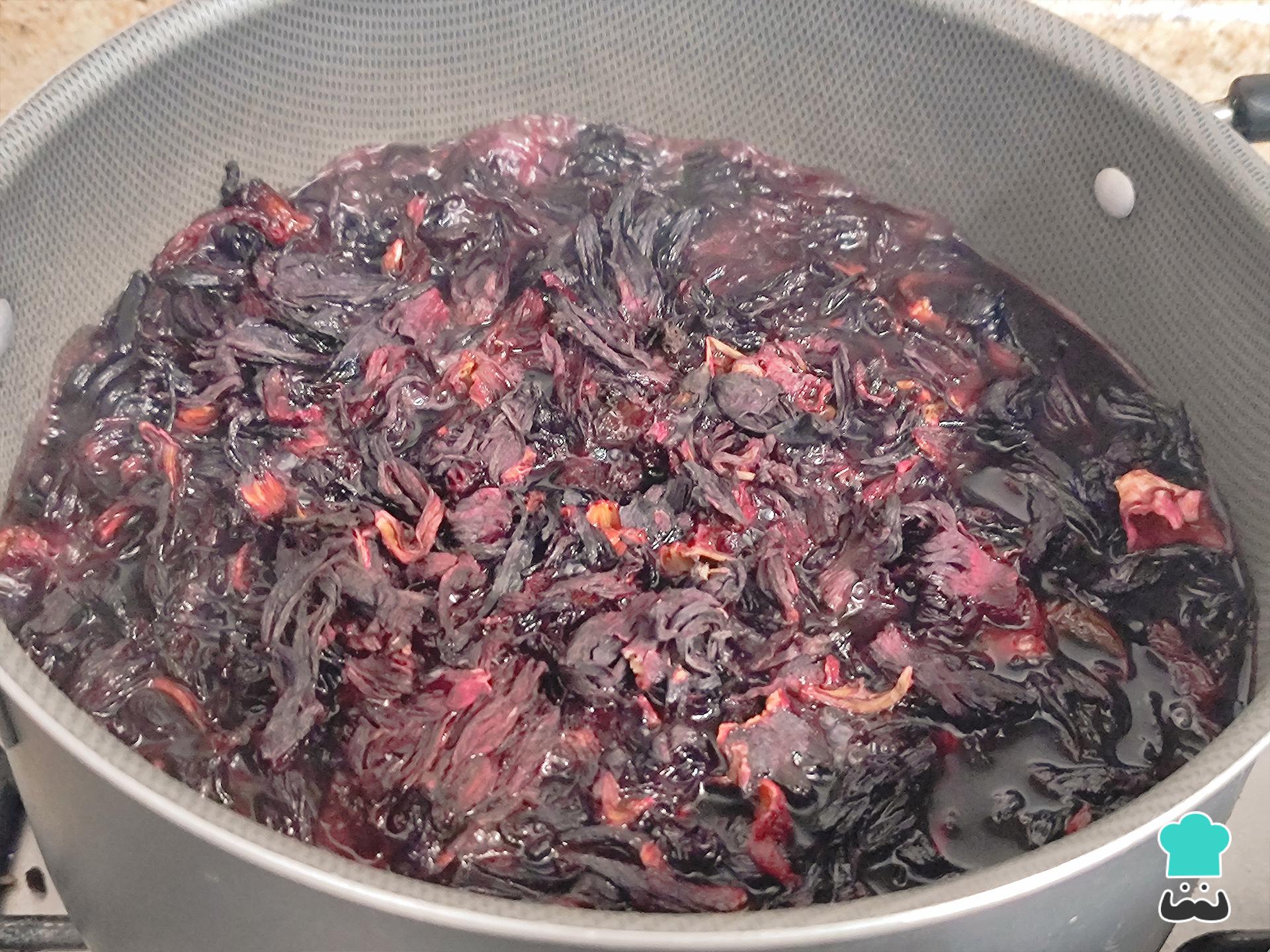 Apaga el fuego y deja reposar la infusión de flor de Jamaica por 15 minutos. Luego, retira las flores y reserva el líquido.