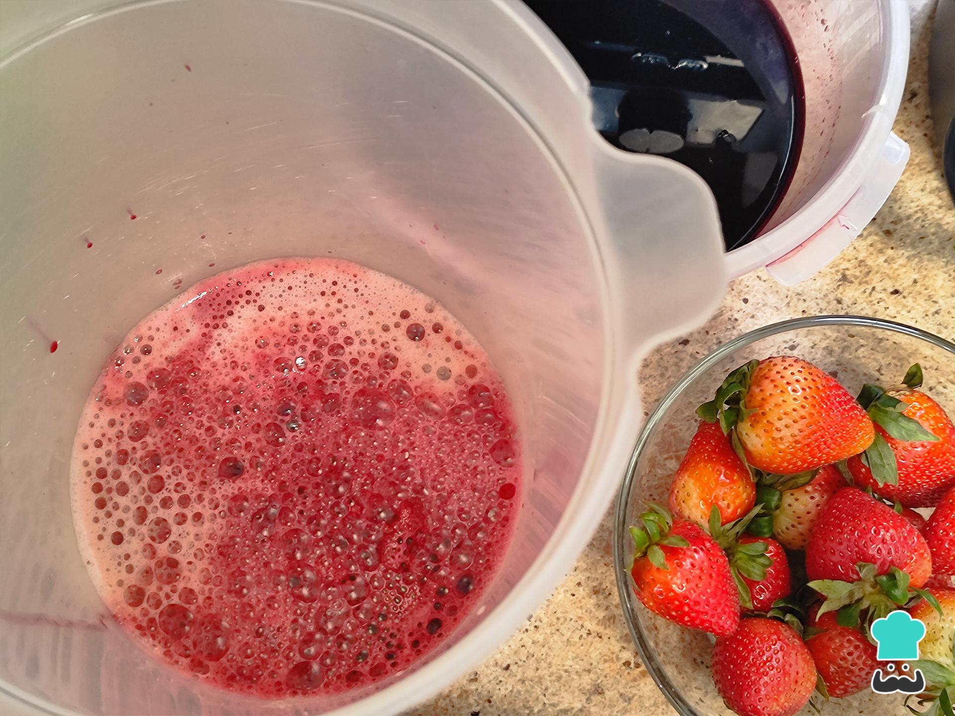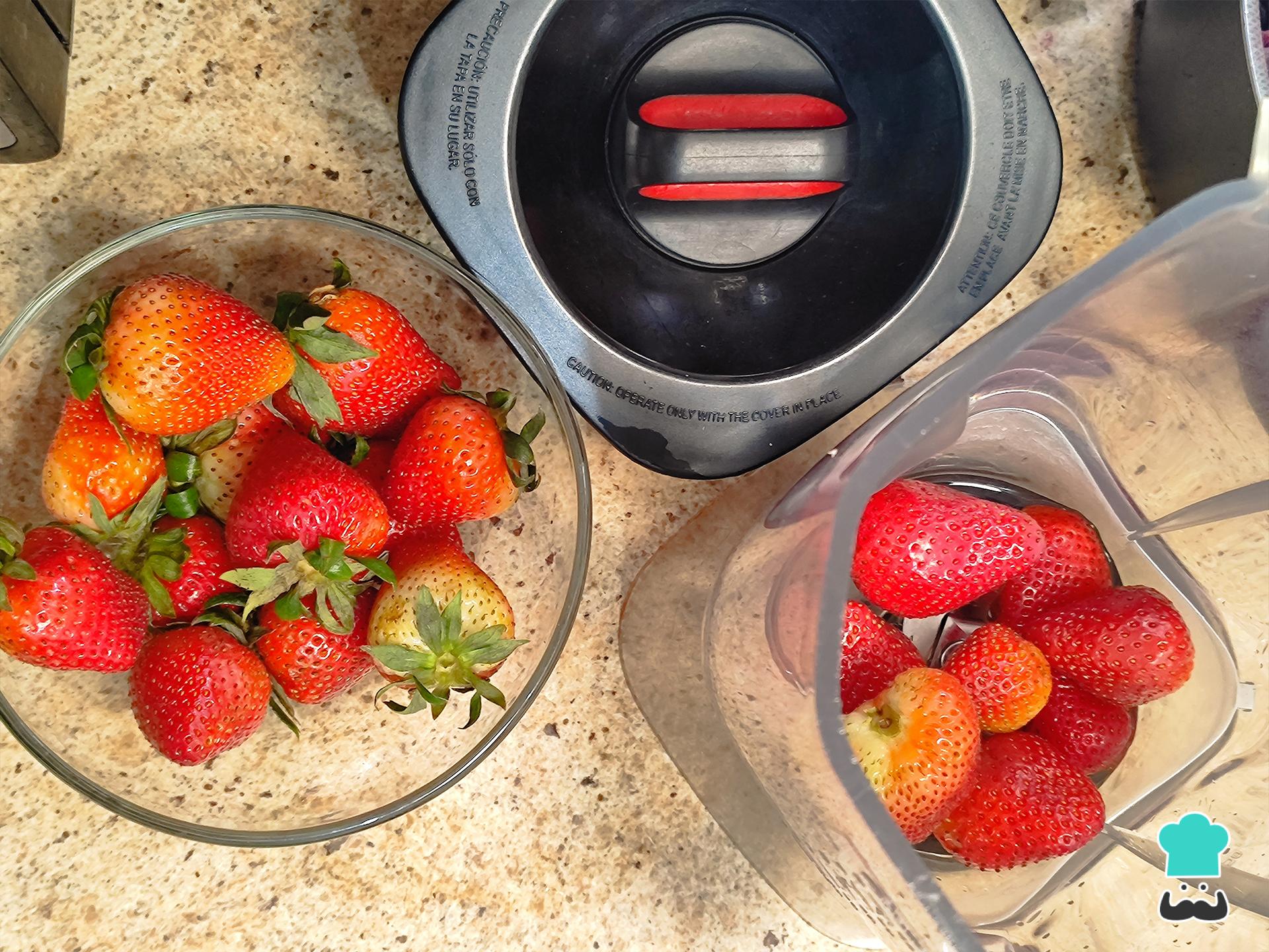 En la licuadora, procesa las fresas con un poco de agua fría hasta obtener un puré suave y homogéneo.