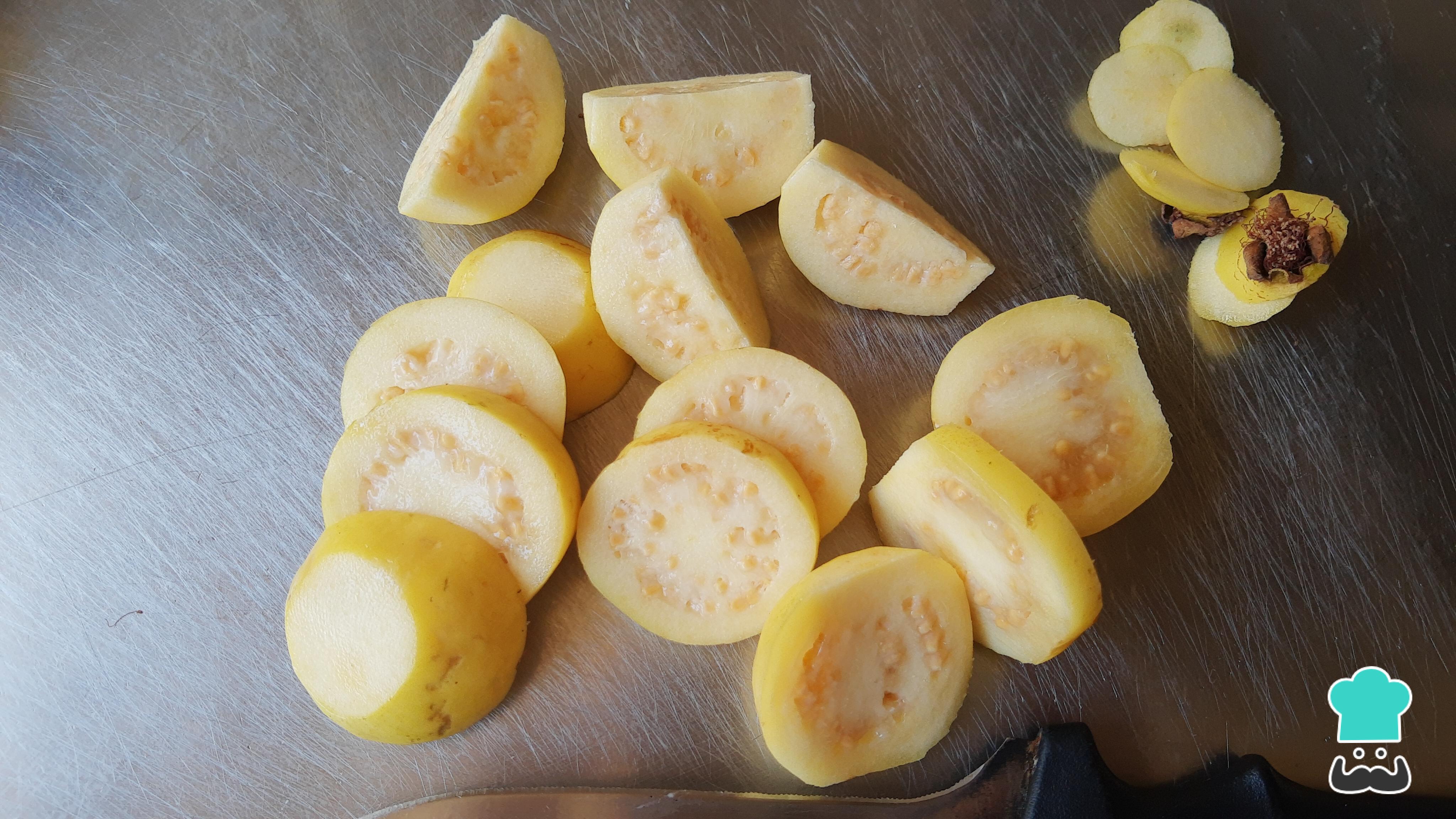 Corta las guayabas quitando el rabillo y la punta. Luego, rebana para que sea fácil molerlas.