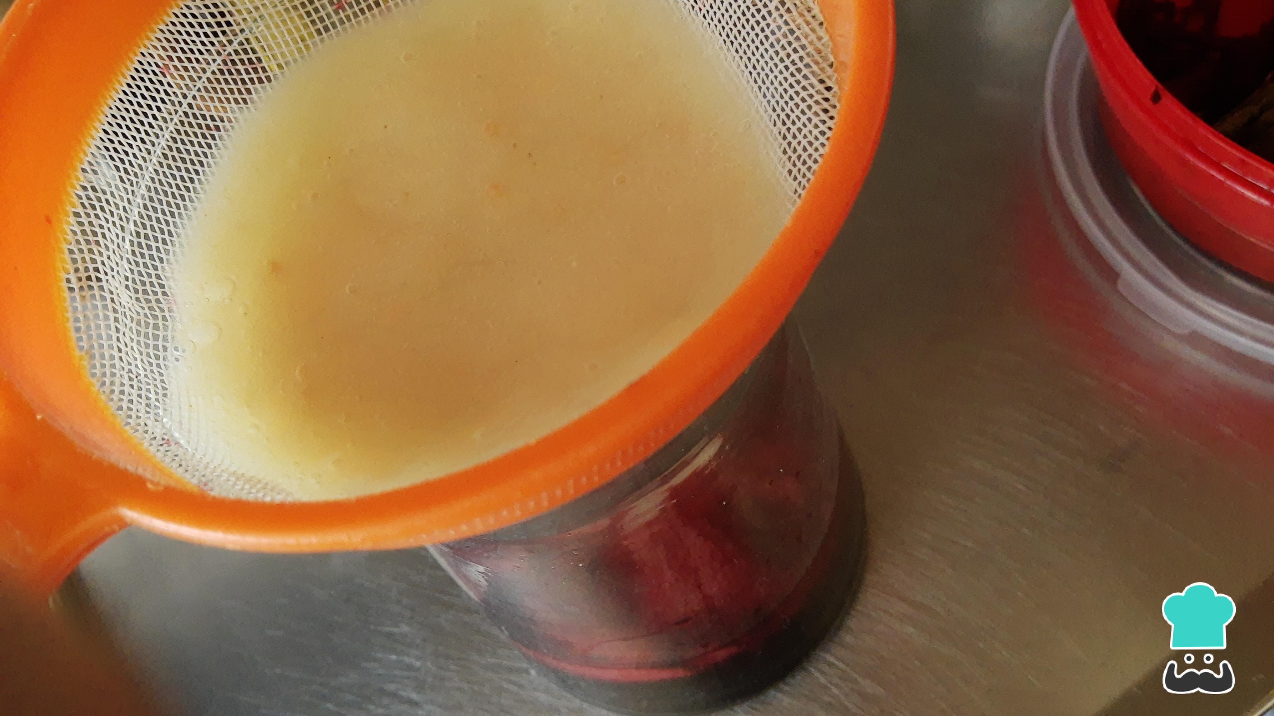 Por último, vacía también la guayaba licuada pasando por un colador antes. A continuación, agrega 3 tazas más de agua y mezcla hasta que se integren.