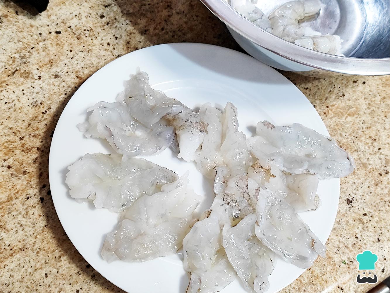 Para comenzar con la receta, limpia los camarones, retira la cáscara y la tripita, luego haz un corte mariposa para abrir el camarón.