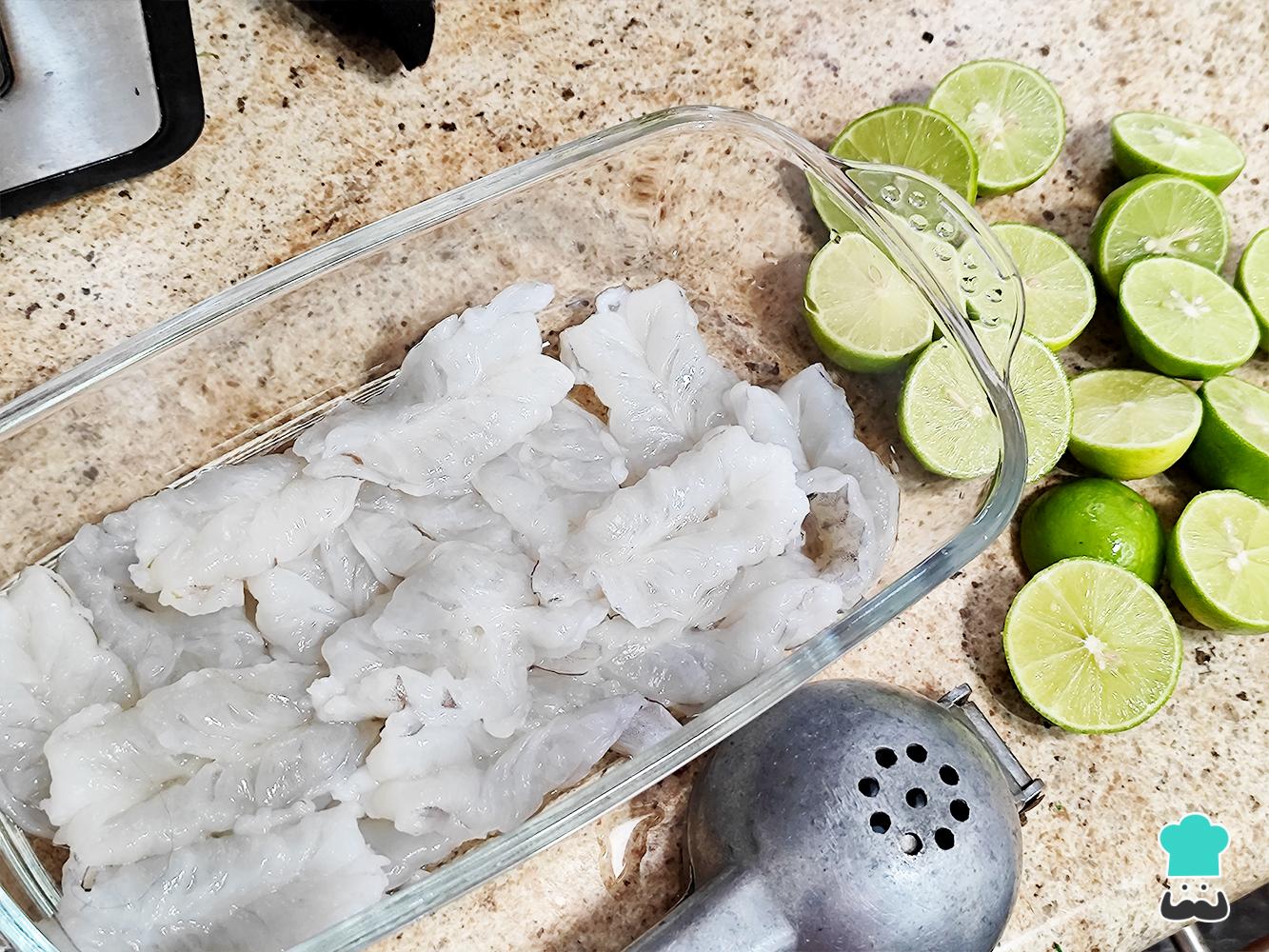 Coloca los camarones en un recipiente de vidrio preferentemente y cúralos con el jugo de 6 limones. Deja reposar en refrigeración por 20 minutos, hasta que se tornen opacos.