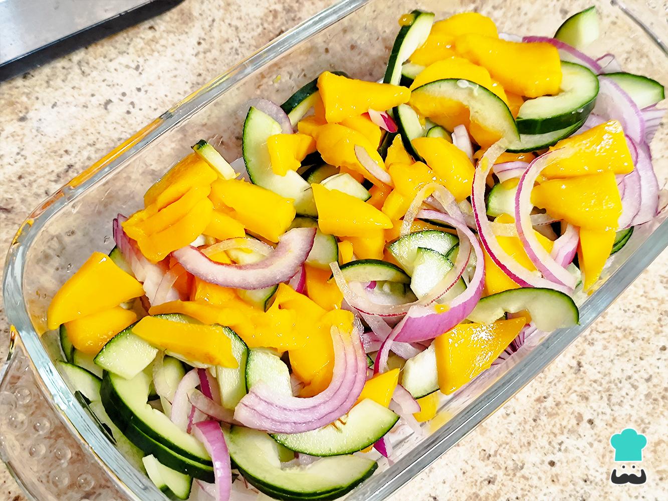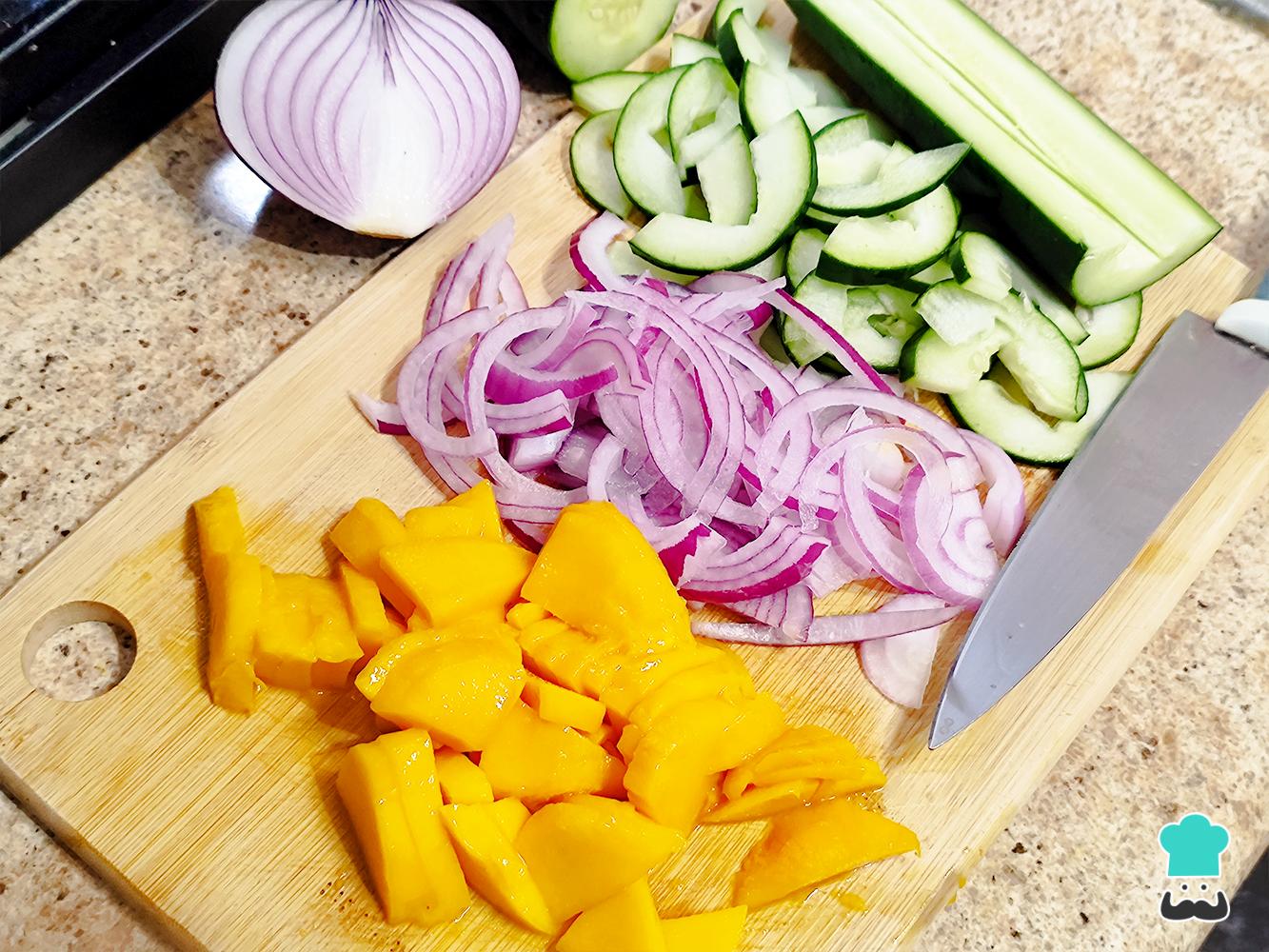 Mientras se cura el camarón pica la verdura, la cebolla en julianas y el pepino en medias lunas, también pica un mango en tiras o trozos de tamaño mediano.
