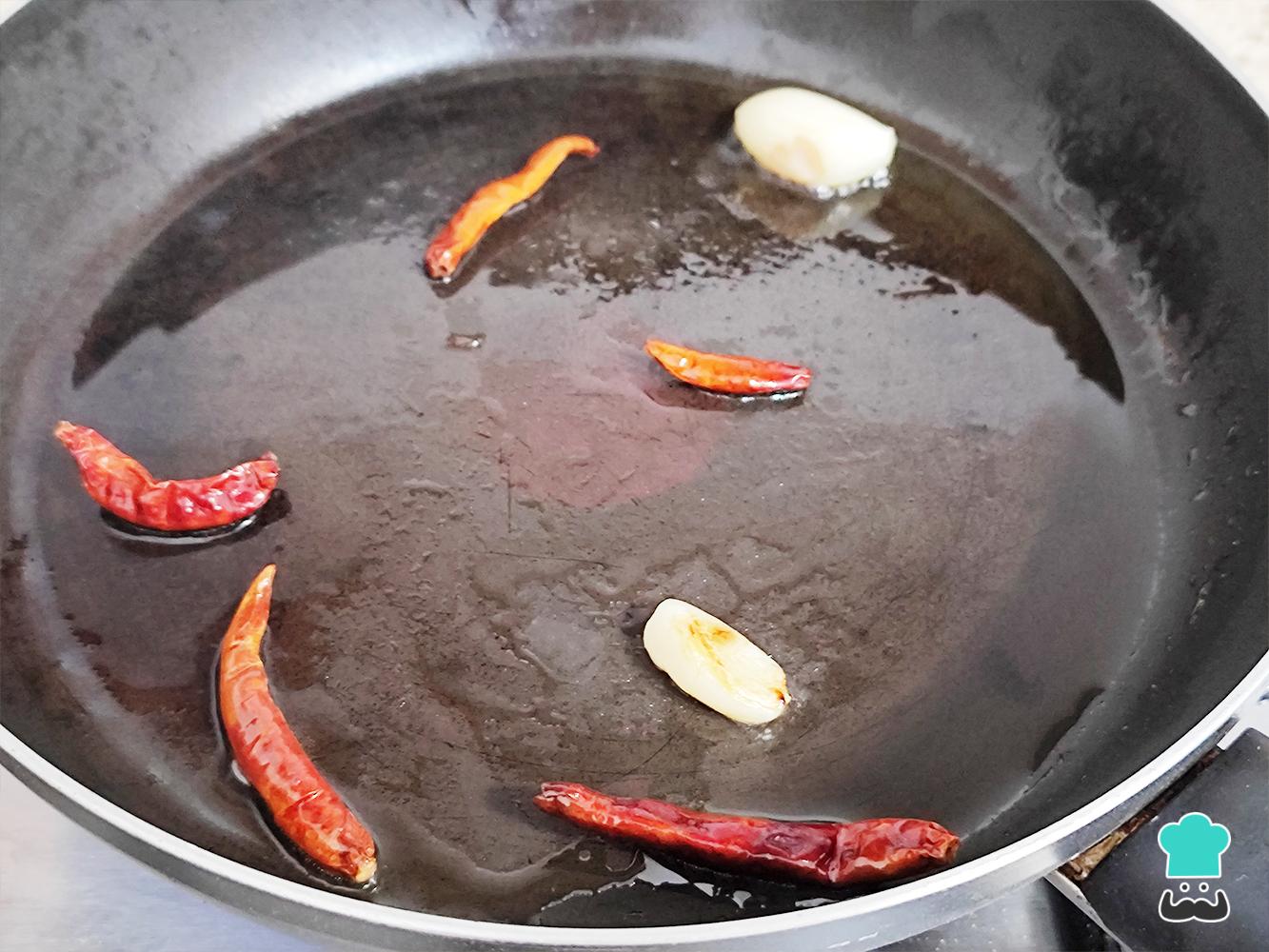 Para la salsa, en un sartén con un poco de aceite dora los dientes de ajo y los chiles de árbol, remueve constantemente para que no se quemen. Puedes utilizar también chile habanero o serrano al gusto.