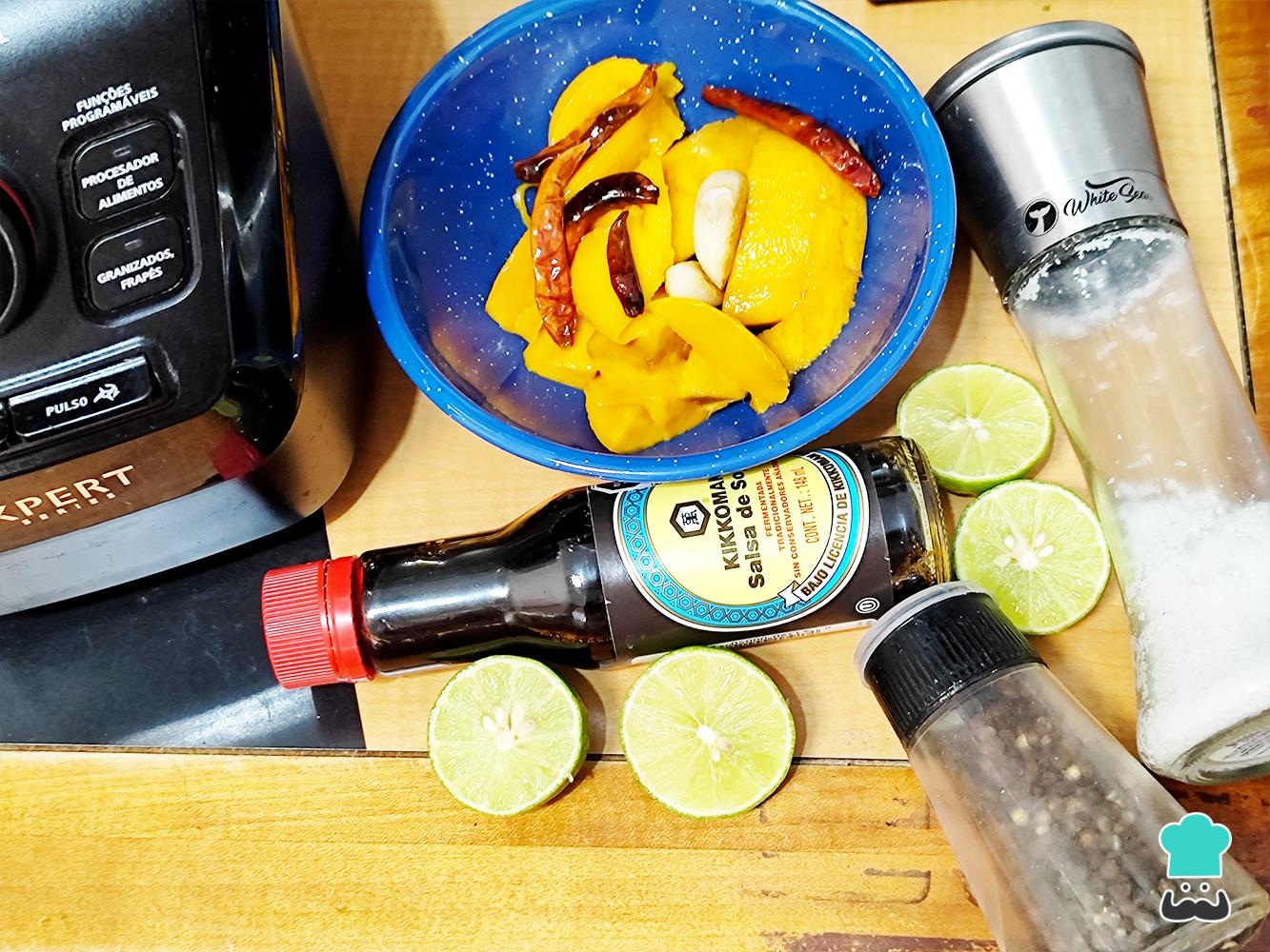Licúa la base del aguachile, agrega a la licuadora un mango picado, la salsa de soya, los chiles y el ajo dorados, sal, pimienta y el jugo de 9 limones.