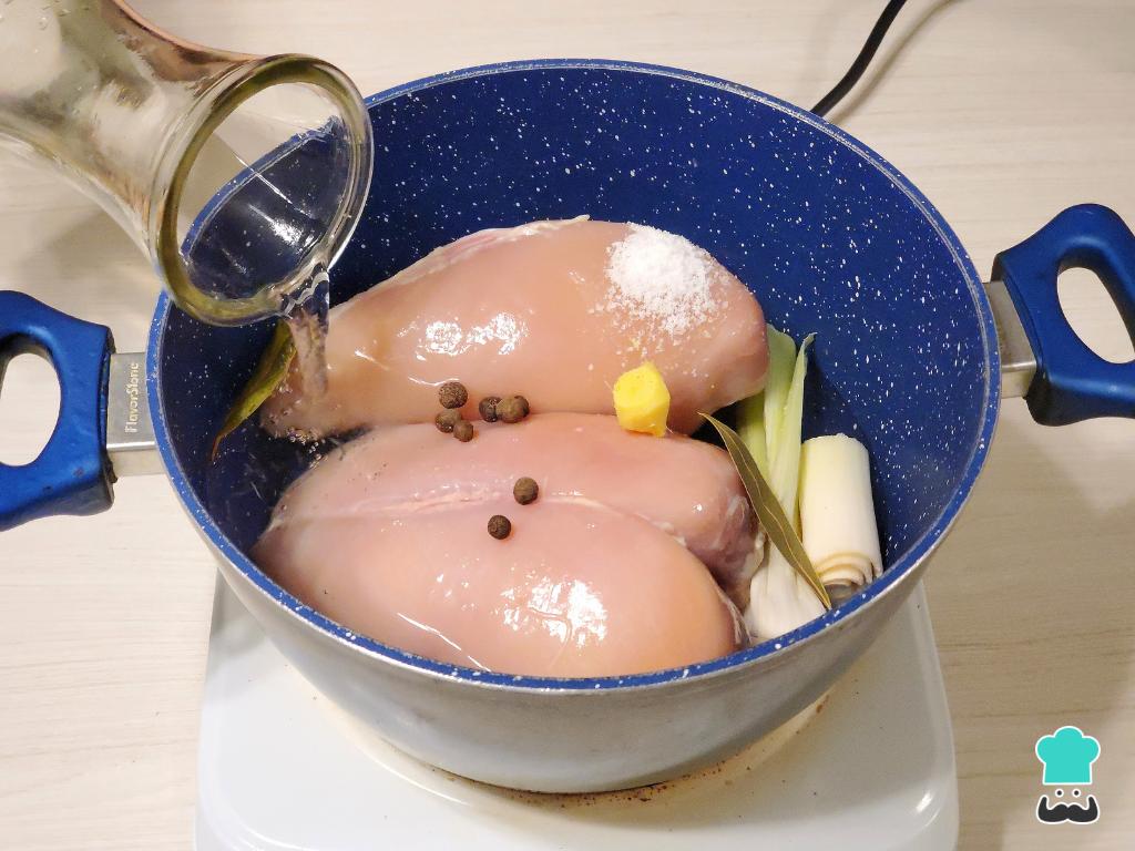 Empieza sancochando el pollo. Retira la piel y cualquier resto de grasa que encuentres en la pechuga de pollo; luego, colócalo con la carcasa en una olla grande y aromatiza con dientes de ajo, un trozo de kion, poro, cebolla, hojas de laurel, pimienta entera y una pizca de sal. Cubre con agua y deja hervir hasta que el pollo esté perfectamente cocido. Cuando esté listo, cuela el caldo y resérvalo. La pechuga, déjala entibiar y deshiláchala en hebras delgadas.
