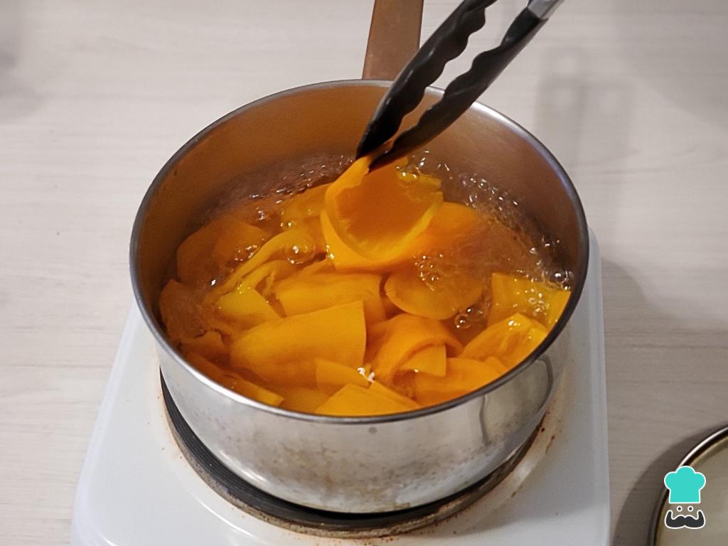 Por otro lado, despepita los ajíes, colócalos en una olla pequeña con agua caliente y deja hervir por 15 minutos o hasta que la piel se pueda desprender fácilmente. Seguidamente, escúrrelos, deja que enfríen, retírales la piel y lícualos con un poco de caldo de pollo. Reserva esta pasta para más adelante.