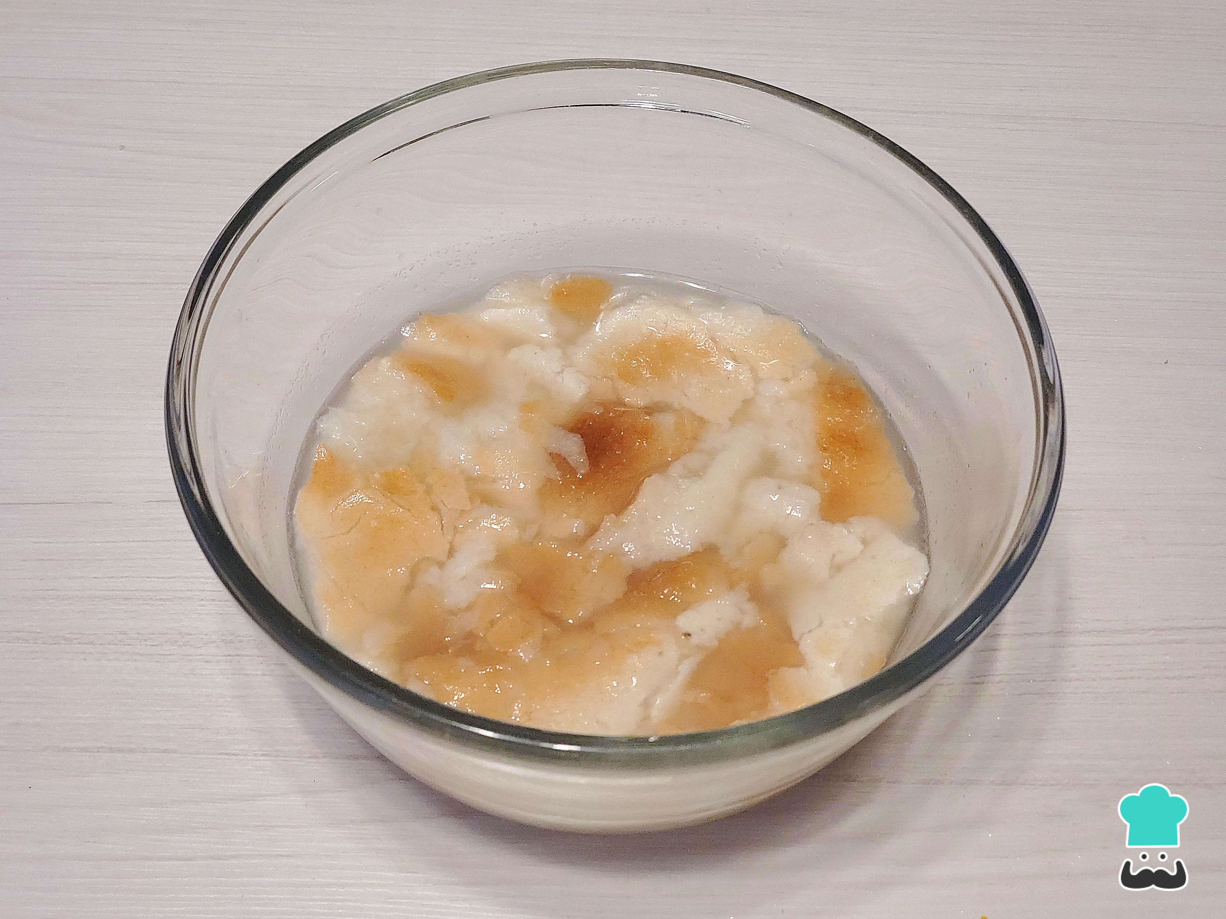Aparte, en un bowl, pon el pan a remojar con un poco del caldo de pollo caliente o con la leche. Déjalo hidratar por un par minutos y cuando esté muy suave, desmenúzalo con un tenedor o tritúralo en la licuadora. Reserva.