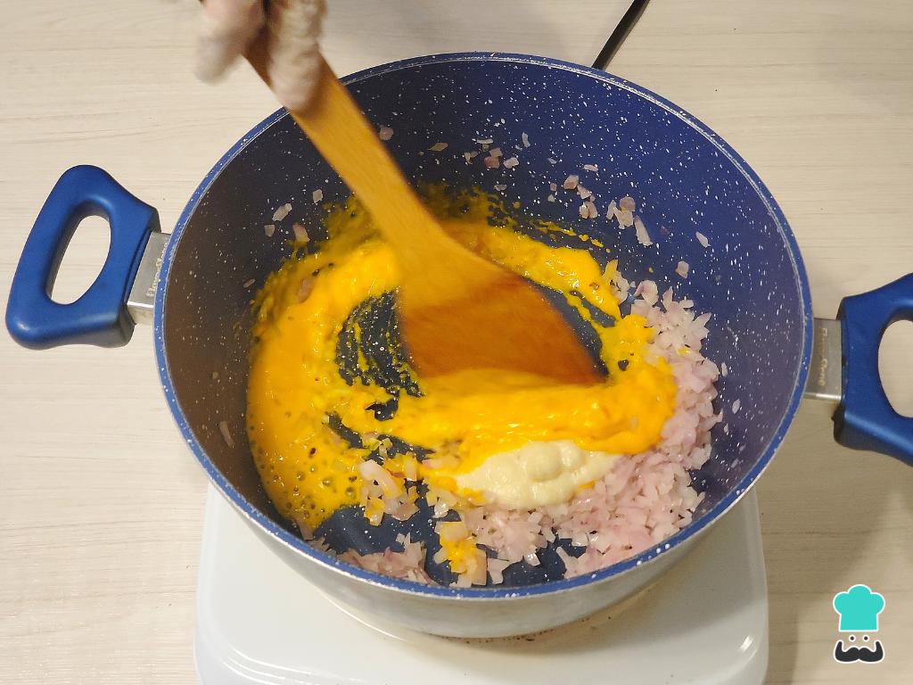 Ve moviendo esporádicamente hasta que este aderezo obtenga la textura de una mermelada. A continuación, vierte la mezcla de pan y un par de cucharadas del caldo de pollo.