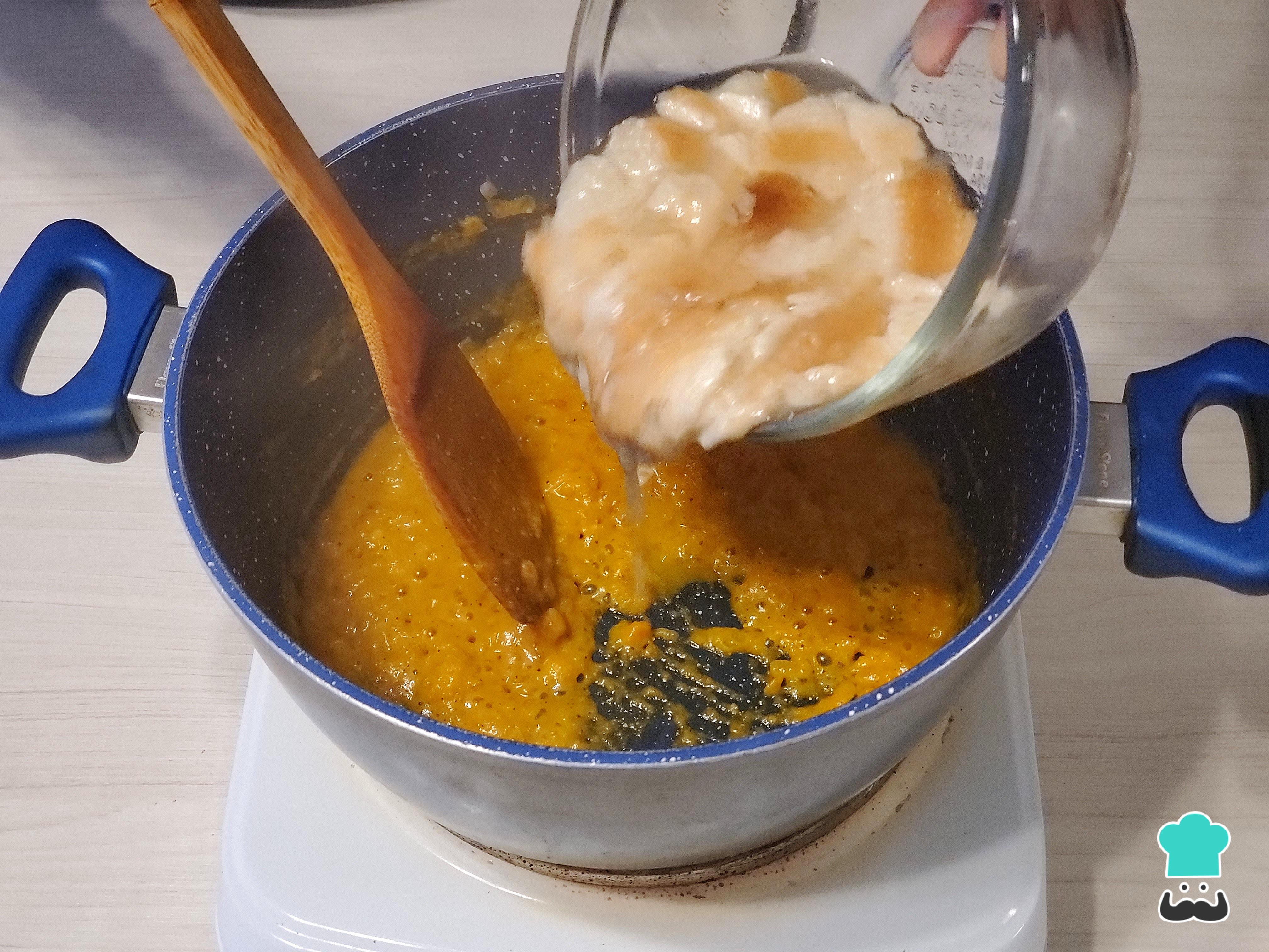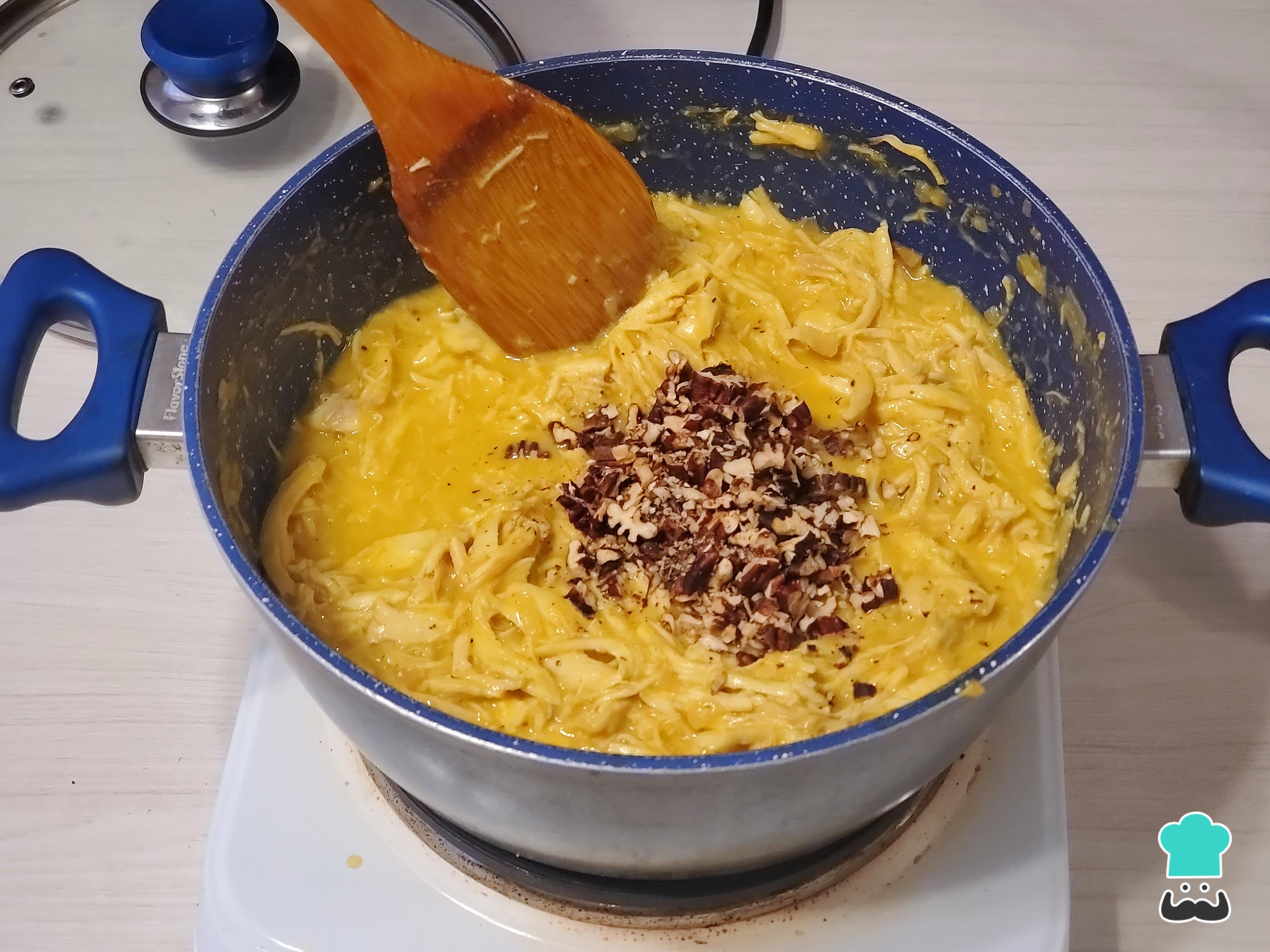 Por último, vierte el chorro de leche si no lo hiciste anteriormente y añade las pecanas picadas.