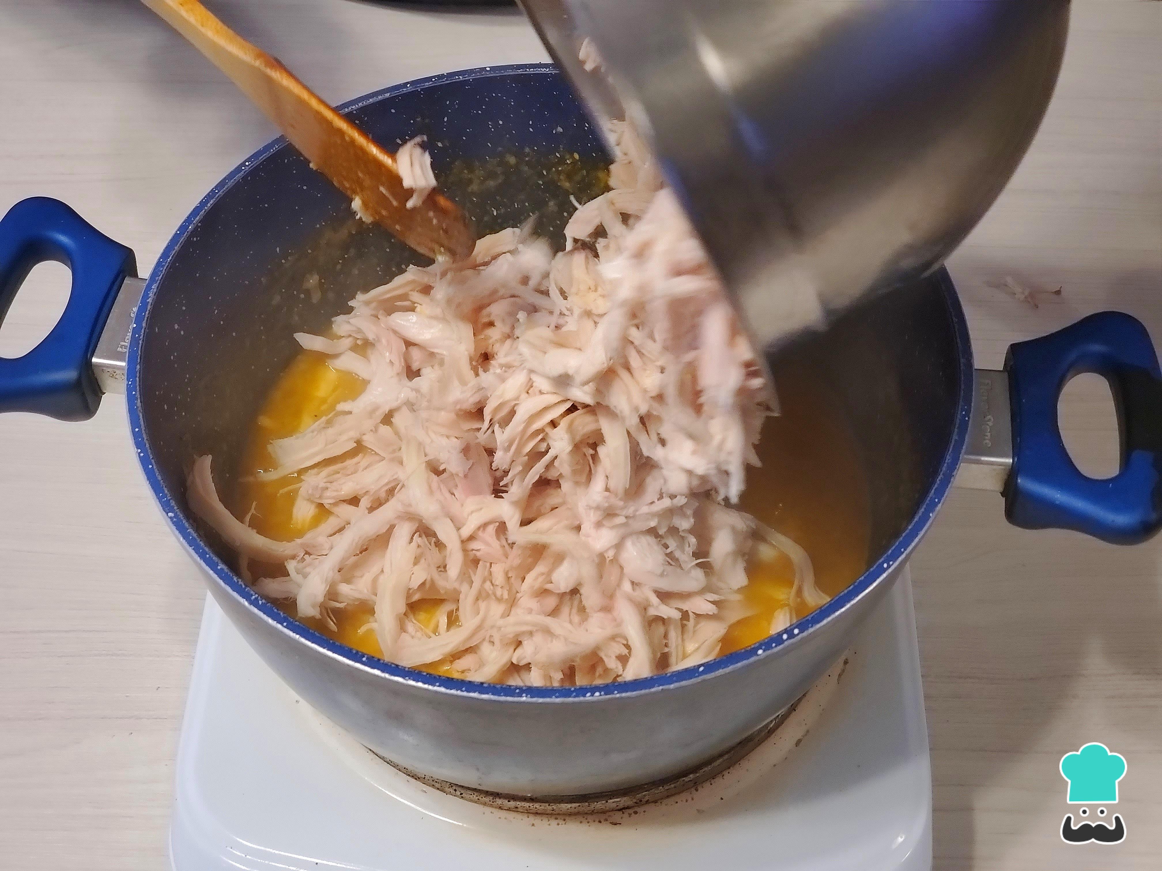 Mantén a fuego medio hasta que hierva e incorpora el pollo deshilachado, mezcla bien hasta que espese y rectifica la sazón.