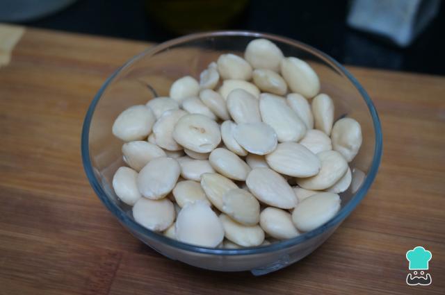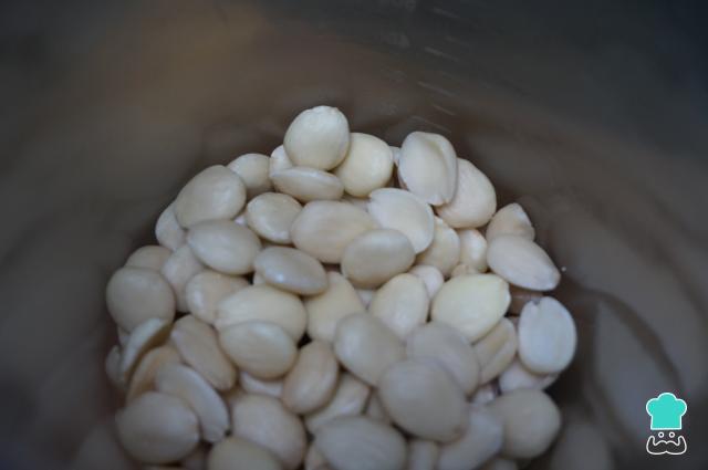 Para empezar con la receta de ajo blanco sin pan, primero añade las almendras en remojo, las puedes tener unas horas o de un día para otro. Este paso se realiza para que queden más tiernas, se triture mejor y así la crema quede mucho más fina. En nuestro caso hemos dejado las almendras en remojo durante 3 horas. También debes saber que, si lo deseas, puedes preparar el ajoblanco sin almendras, pero en esta ocasión, es el ingrediente principal, ya que no lleva pan.