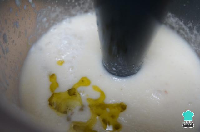Vierte un vaso de agua y empieza a triturar, quedará una masa contundente. Enseguida, sigue triturando y añadiendo agua según vaya necesitando la crema para que pueda desmenuzarse mejor y quede más fina. Cuando tengas la crema casi triturada, incorpora el aceite poco a poco para que vaya emulsionando.