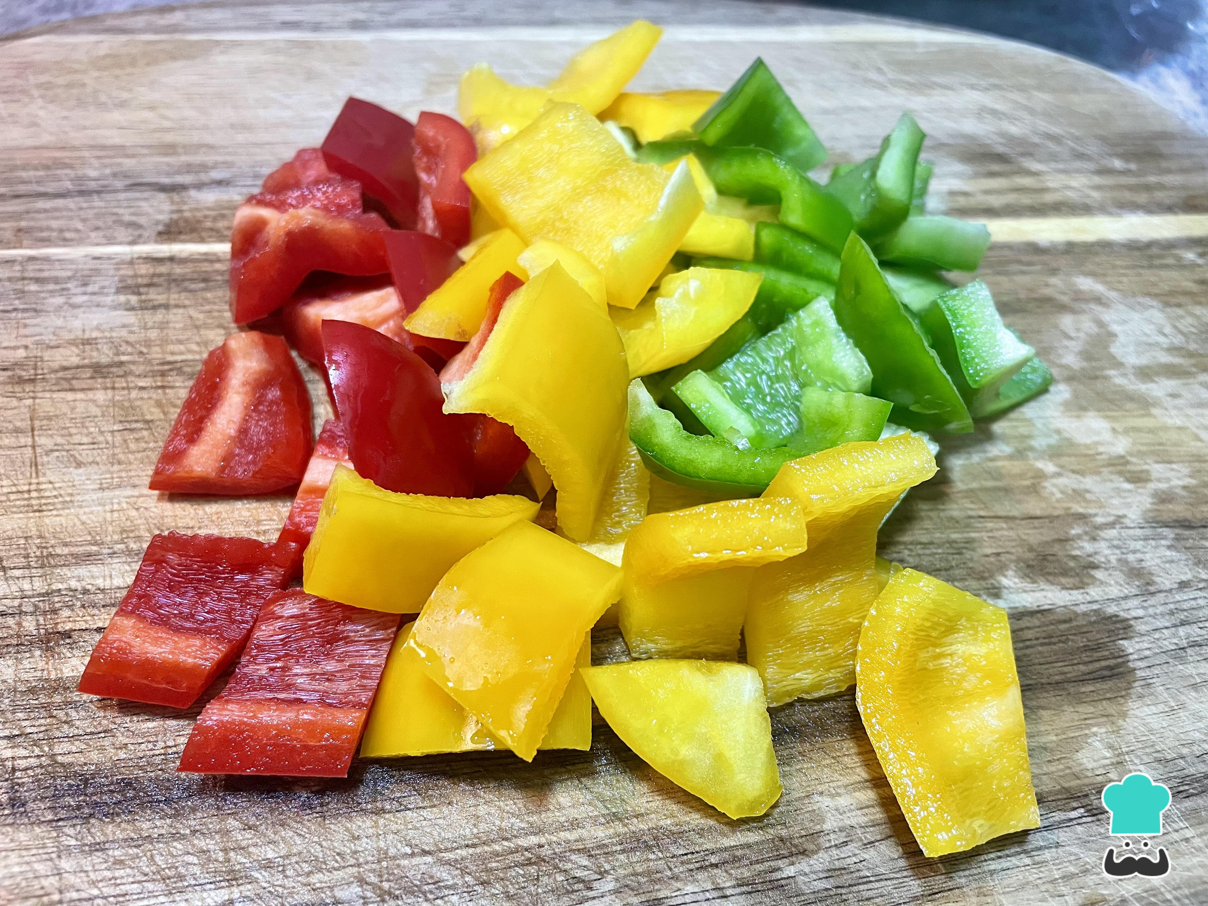 Lava muy bien los pimentones y la cebolla. Luego, córtalos en cuadritos del tamaño de bocado.