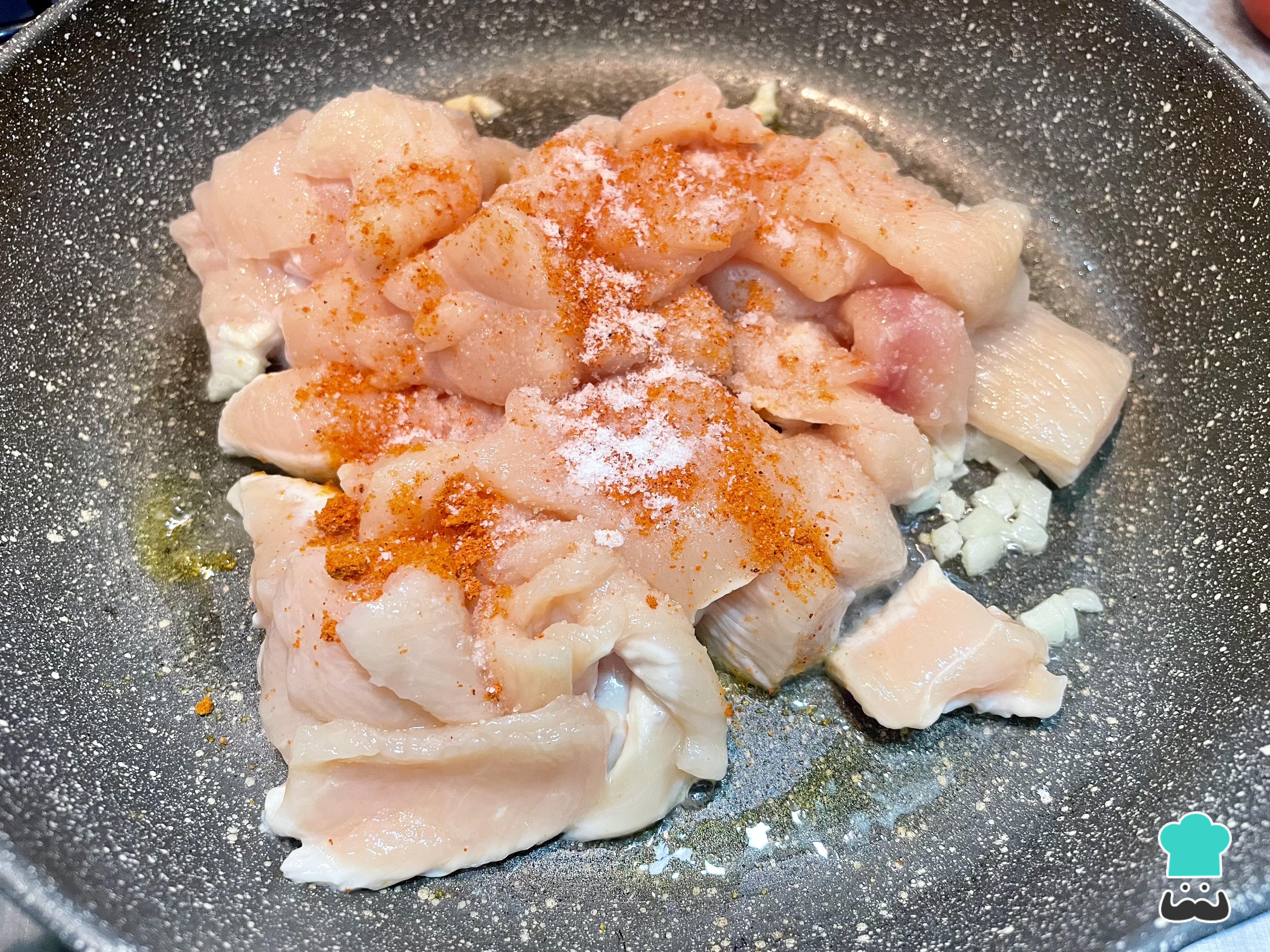 Corta el pollo en cubos pequeños para que se cocine de manera uniforme. Agrégalo al sartén junto con sal y los condimentos de tu preferencia, luego cocínalo hasta que el pollo empiece a cambiar de color.