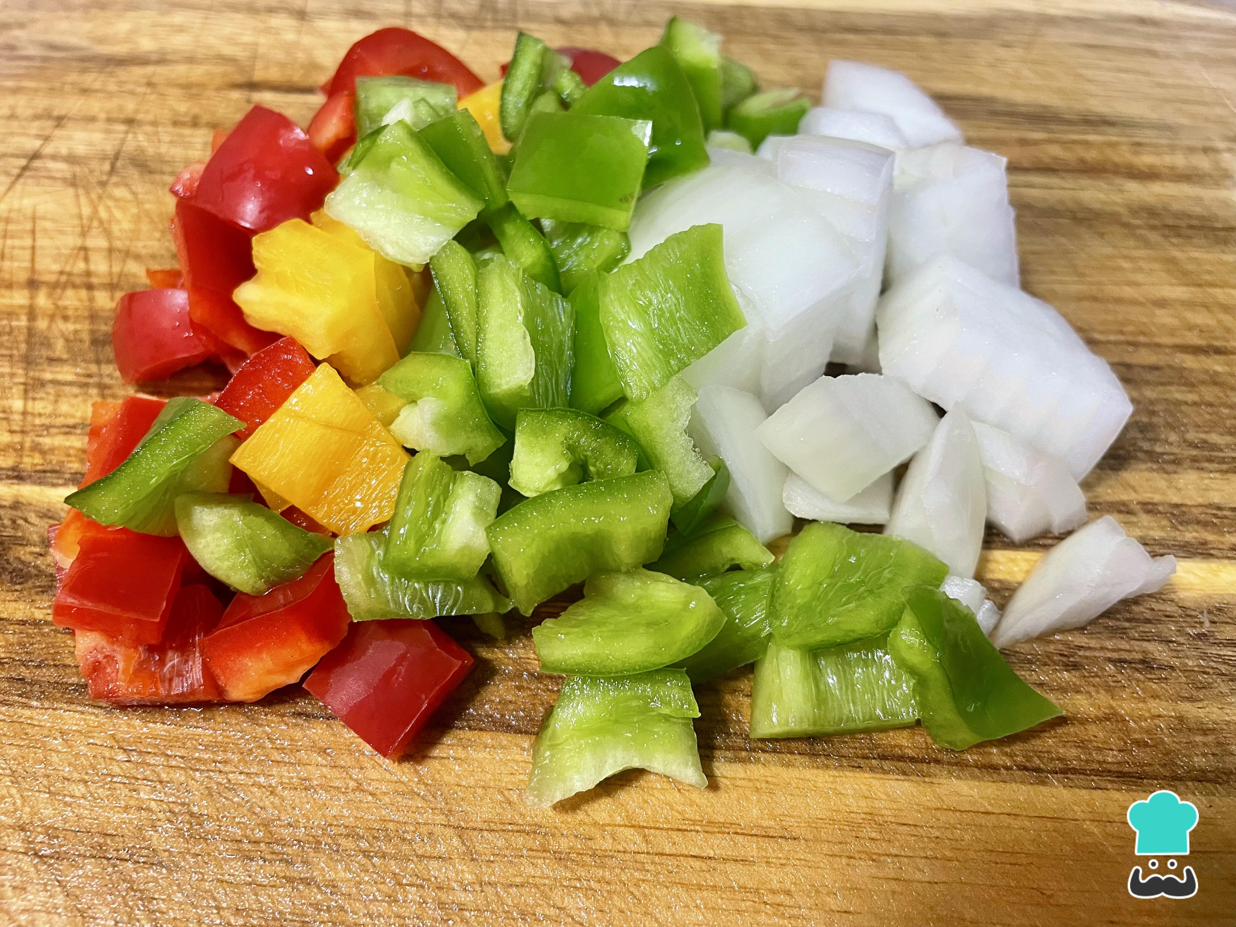 Lava y corta los pimientos y la cebolla en cuadritos del tamaño de bocado.
