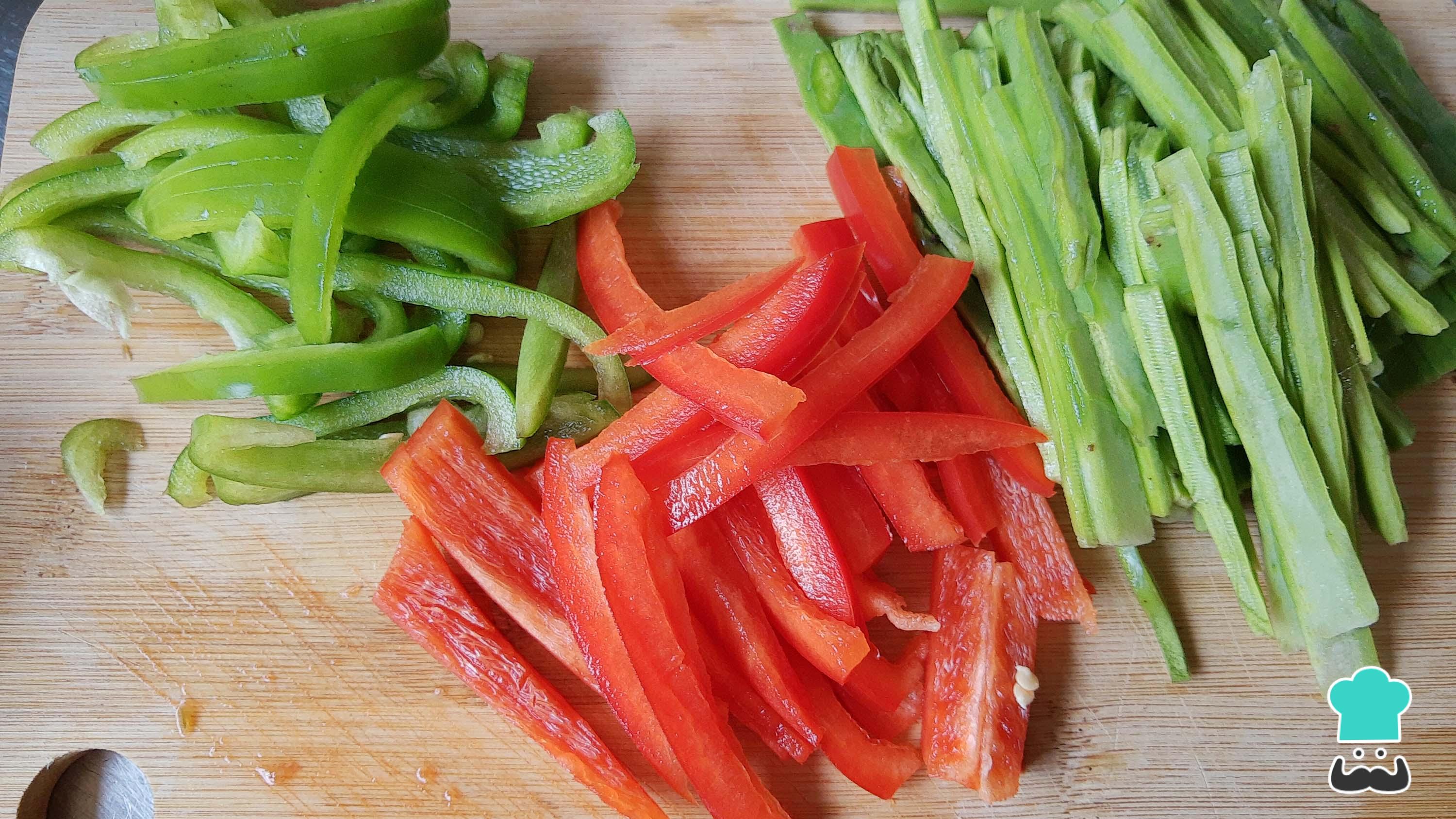 Pica en julianas los nopales y los pimientos verde y rojo, asegúrate de limpiar los pimientos previamente quitando las semillas y las venas.