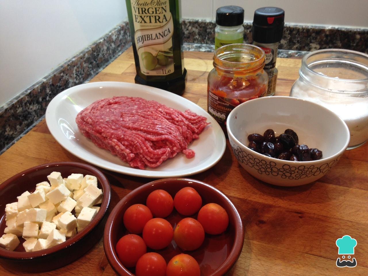 Preparamos los ingredientes para estas originales albóndigas. Para la carne picada, la mejor elección es una mezcla de vacuno y porcino. En cuanto al queso griego, recurrimos al feta ya cortado en taquitos.