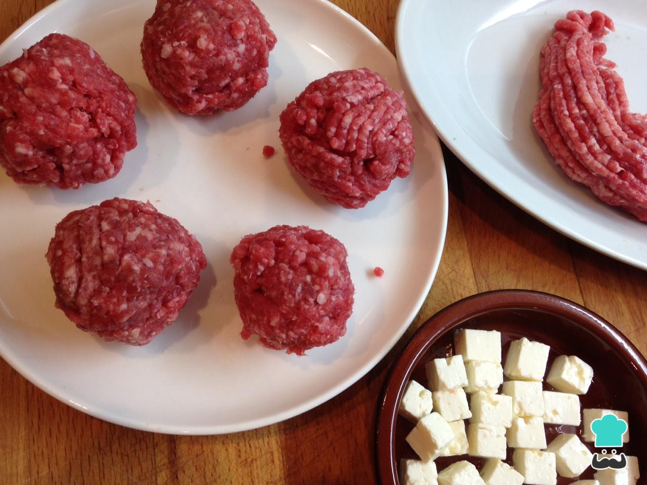 Elaboramos las albóndigas caseras con las manos. Cogemos un trozo de carne, insertamos dentro dos o tres trozos de queso feta, y a continuación formamos la pelota, apretando bien para que quede cohesionada. Aunque la receta original no dice que debamos rellenar las albóndigas con queso, nosotros hemos decidido hacerlo para darle un toque especial y hacerlas más apetecibles para los más pequeños de casa.