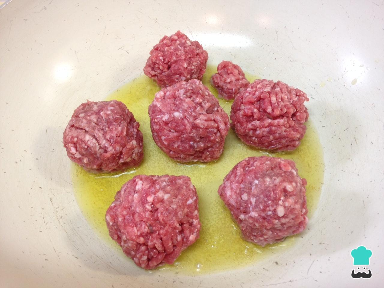 En una sartén freímos las albóndigas a fuego muy bajo. Las pelotas quedarán de un tamaño considerable, por lo que necesitamos fuego suave y bastante tiempo de cocción, para que se cocinen también por dentro. Aunque dependerá del tamaño, como referencia calculamos 15 minutos. Iremos girando las albóndigas para que se hagan homogéneamente.