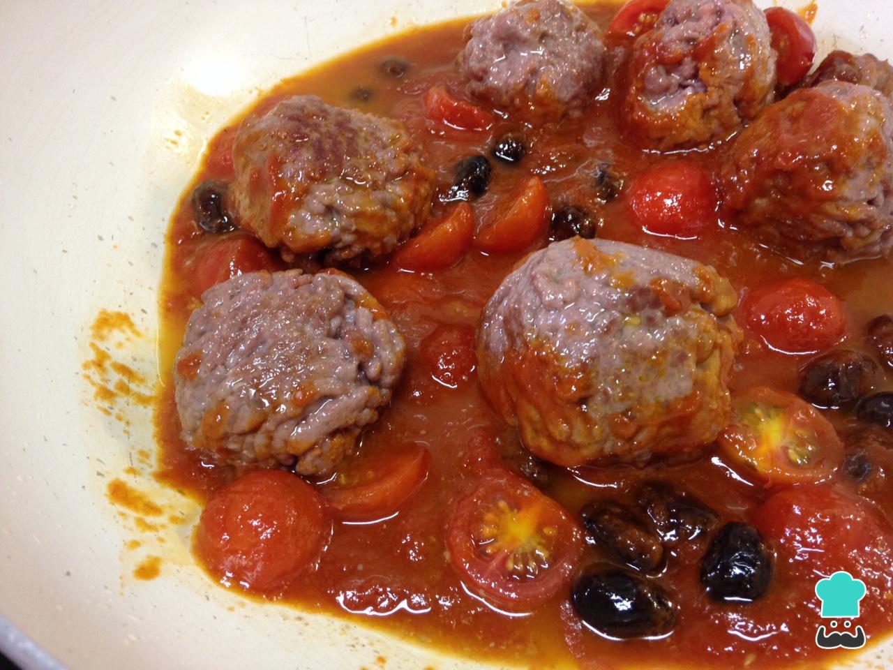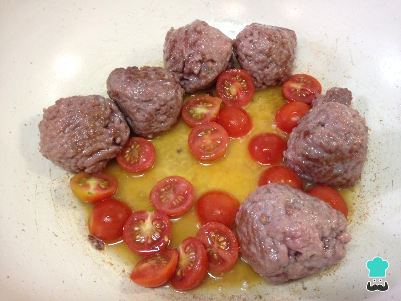 Cuando las albóndigas estén ya doradas, añadimos los tomatitos cherry cortados en mitades, y dejamos que cocine unos cinco minutos más, siempre con el fuego bajo.