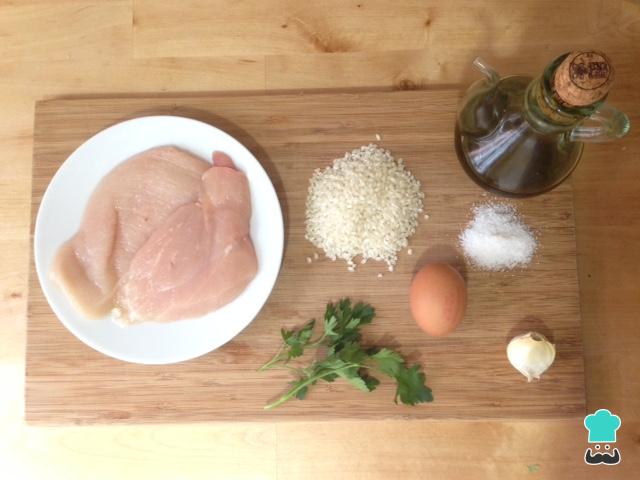 Reunimos todos los ingredientes para elaborar las albóndigas de pollo y arroz. Las cantidades que indicamos son para preparar unas 12 albóndigas.