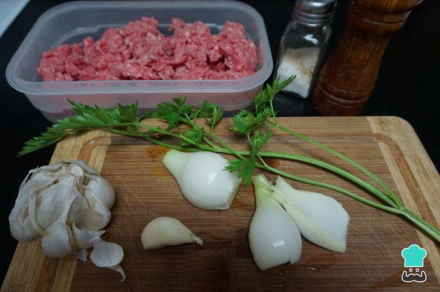 Para hacer las albóndigas en freidora de aire, empieza preparando los ingredientes. La carne picada puede ser de ternera mezclada con un poco de cerdo, de pollo o de pavo. Pícala tú o pídeselo al carnicero que la pique.
