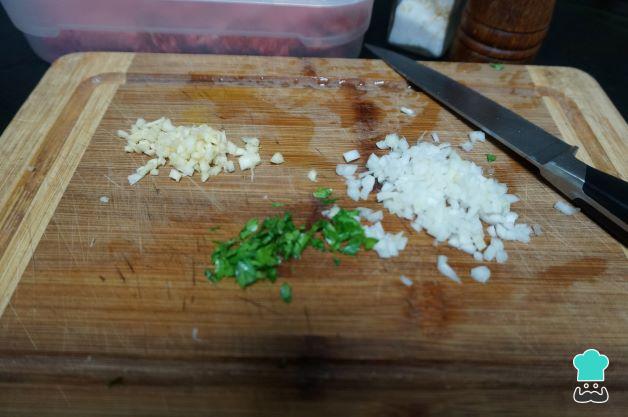 Pica la cebolla y los dos dientes de ajos en trozos muy pequeños. Lava el perejil y pícalo.