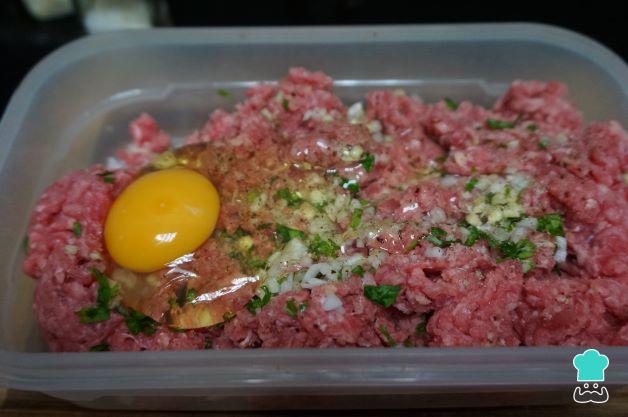 Añade la carne en un bol con la cebolla picada, los dientes de ajos, el perejil y el huevo, mezcla todo muy bien. Pon un poco de sal y pimienta, vuelve a mezclar muy bien. Deja la carne que repose unos 15 minutos para que se mezcle todo bien.