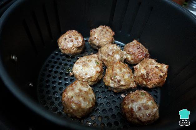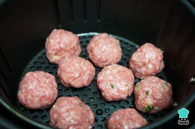 Pinta con una brocha mojada en aceite la base de la freidora y encima añade las albóndigas, así no se pegarán. Añade la freidora a 180 ºC unos 15 minutos.