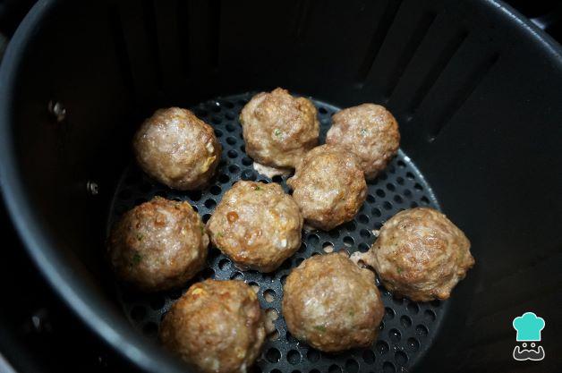 Abre la freidora a la mitad del tiempo para ver como están las albóndigas. Proporciona la vuelta y vuelve a poner la freidora el resto del tiempo para que se terminen de cocinar.